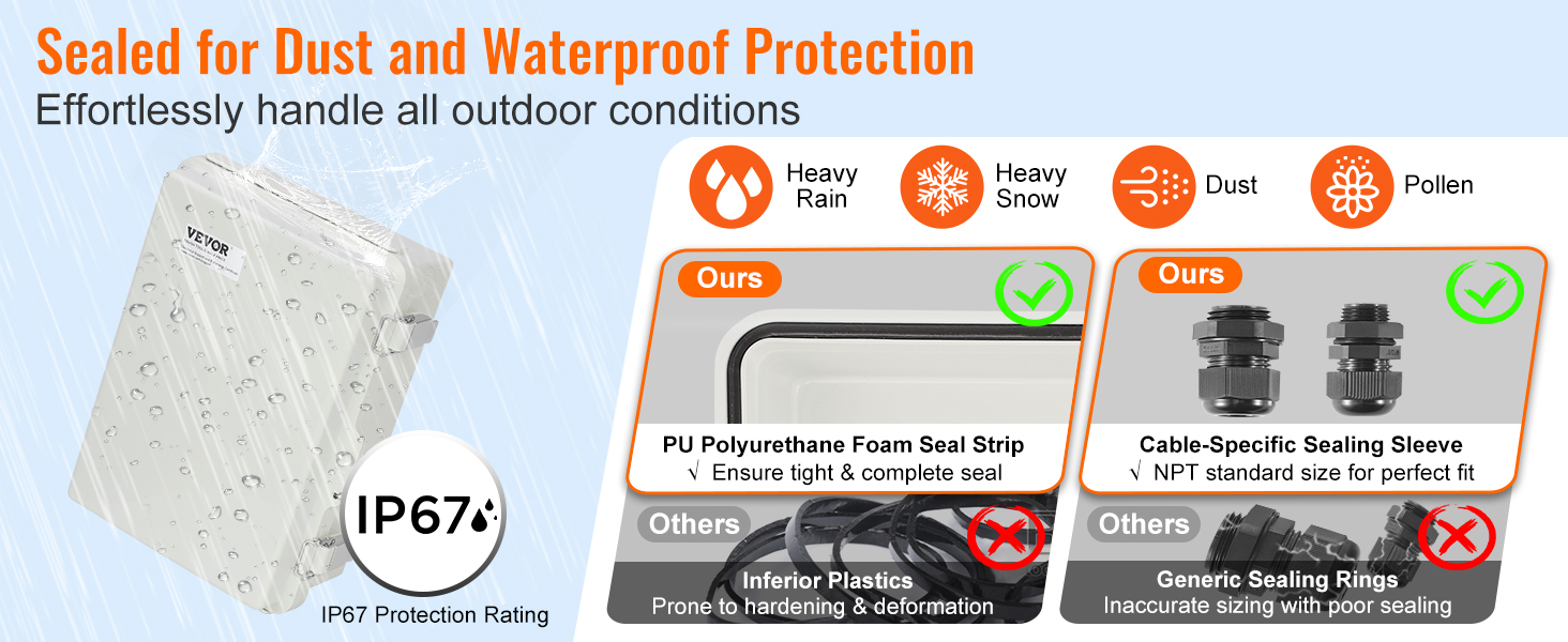 Používame vysokokvalitný tesniaci materiál z polyuretánovej peny PU, čím dosahujeme stupeň odolnosti proti prachu IP6 a stupeň vodotesnosti IP7. Poskytujeme výnimočnú ochranu pred nepriaznivými poveternostnými podmienkami, čím zabezpečujeme, že elektrické zariadenia zostanú neovplyvnené nepriaznivými podmienkami.