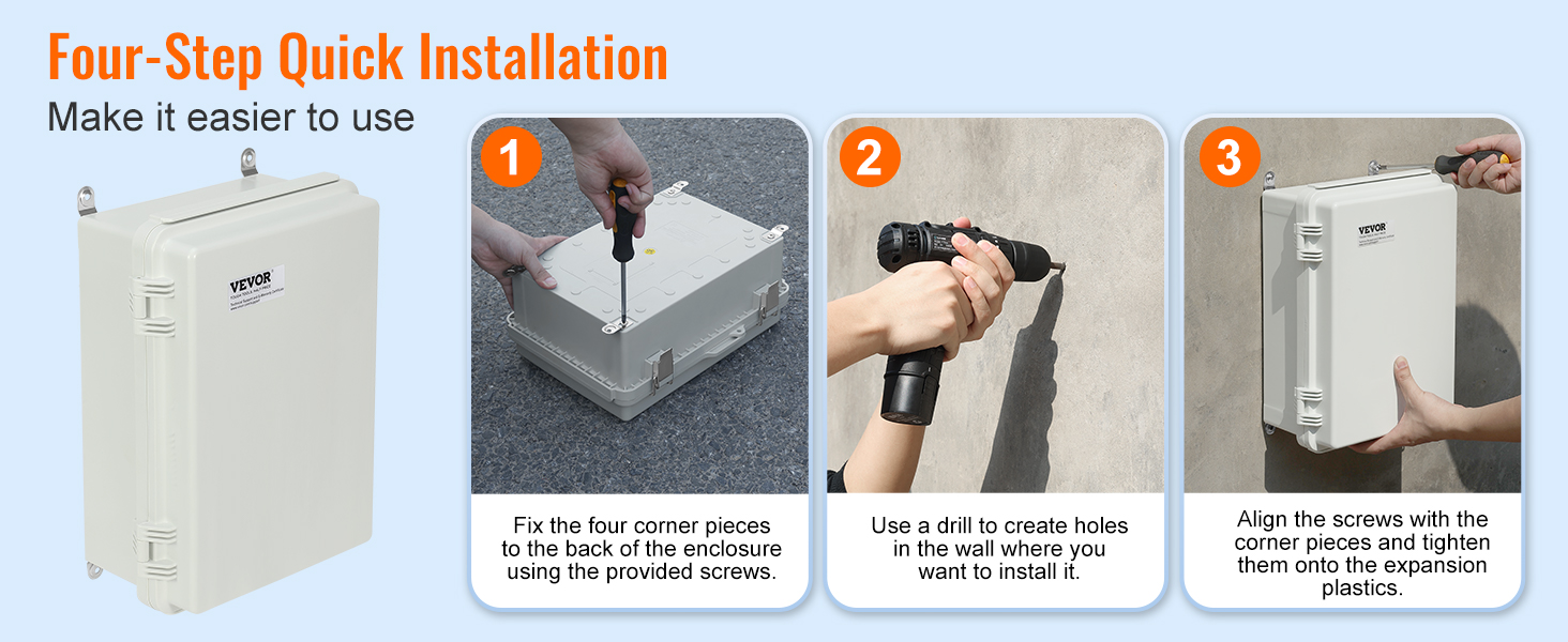 Naša elektrická spojovacia skrinka z ABS sa môže pochváliť vonkajšími rozmermi 16,93 x 12,99 x 7,09 in/430 × 330 x 180 mm a vnútornými rozmermi 15,12 x 11,18 x 6,29 in/384 x 284 x 160 mm, čo poskytuje dostatok priestoru na jednoduché zapojenie. Zvýšte úroveň uskladnenia elektrických komponentov pomocou našej elektrickej skriňovej skrinky!