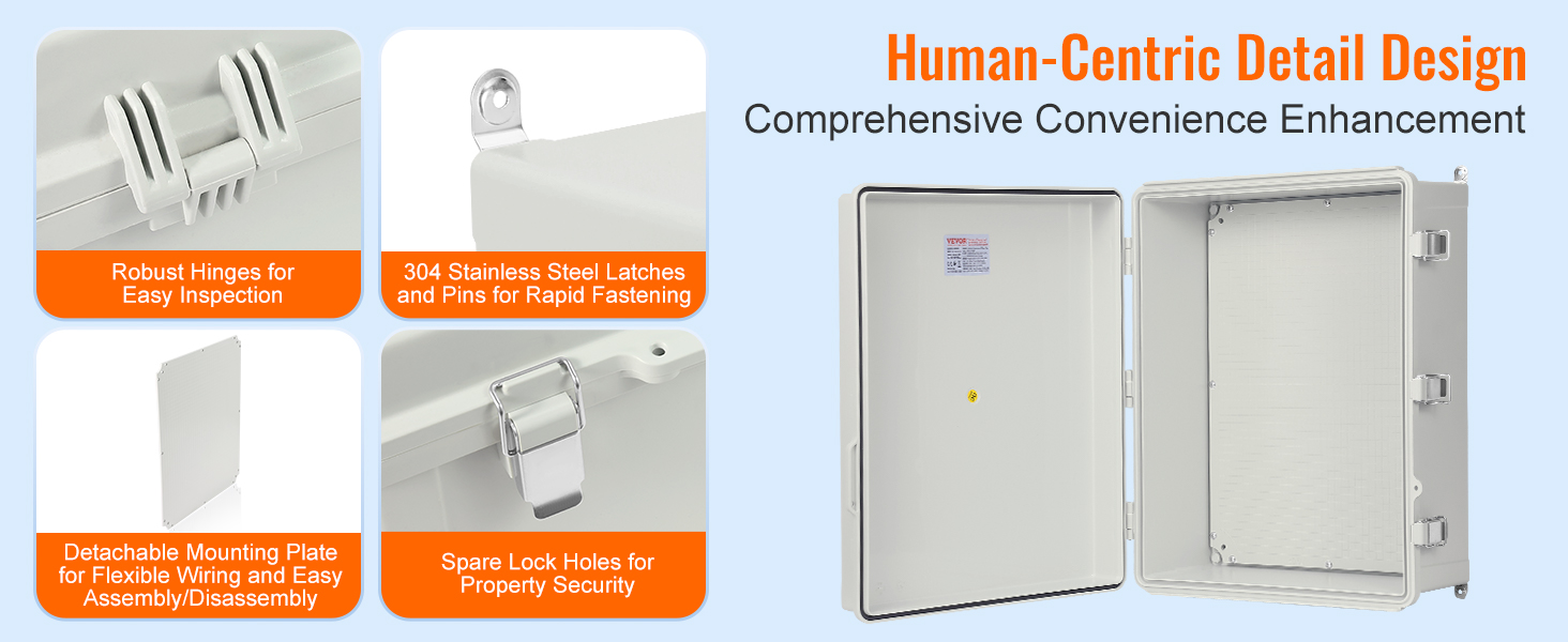 Veko rozvodnej skrine má sklopnú konštrukciu a zámok dvierok z nehrdzavejúcej ocele 304, vďaka čomu sa ľahko otvára a bezpečne zatvára, čo umožňuje rýchlu kontrolu prevádzky. V spojení s odnímateľnou montážnou doskou umožňuje flexibilné zabezpečenie a nastavenie elektrických komponentov.