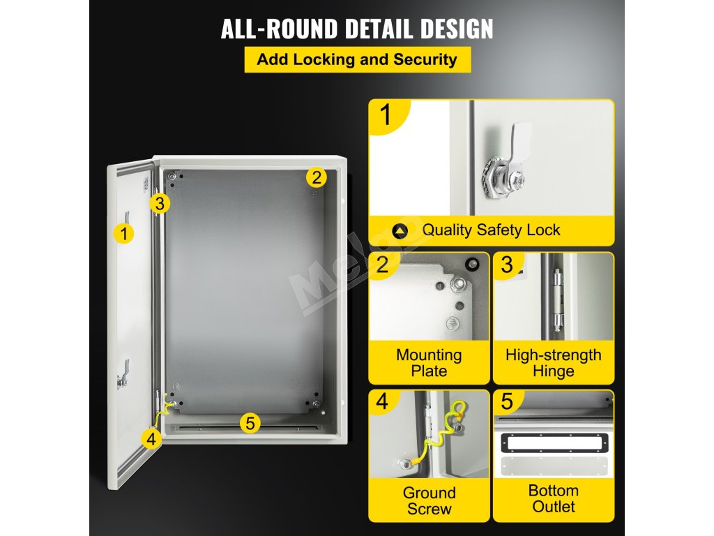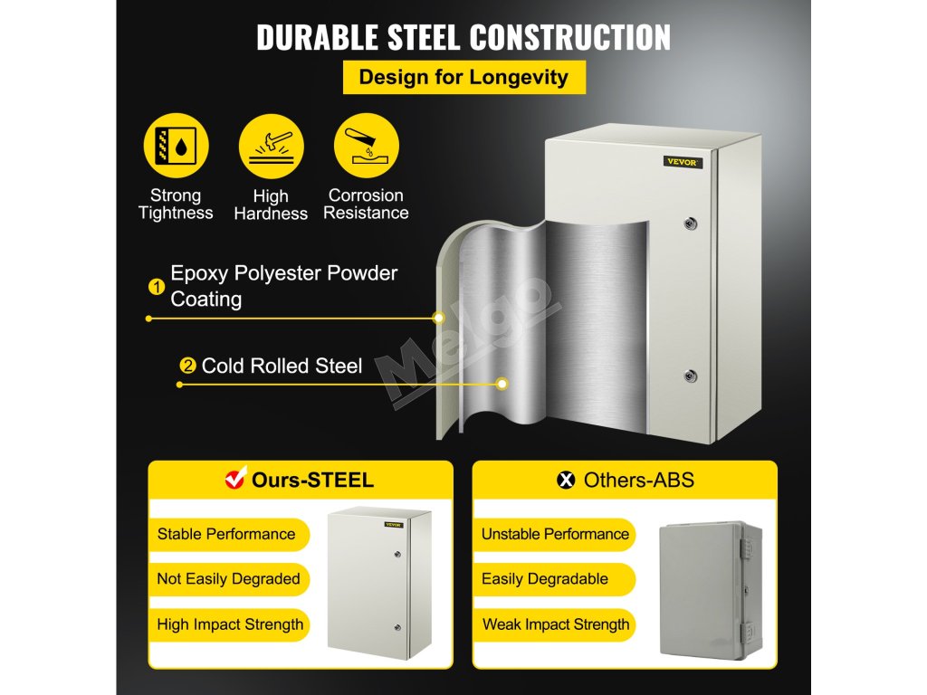 Elektrická skrinka je vyrobená z ocele valcovanej za studena s hrúbkou 0,059''/1,5 mm, vyznačuje sa vysokou húževnatosťou, odolnosťou proti tlaku a hrdzaveniu. Plášť je vyrobený z epoxidového polyesterového práškového laku, ktorý má dobré mechanické a vyrovnávacie vlastnosti.