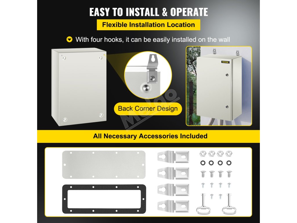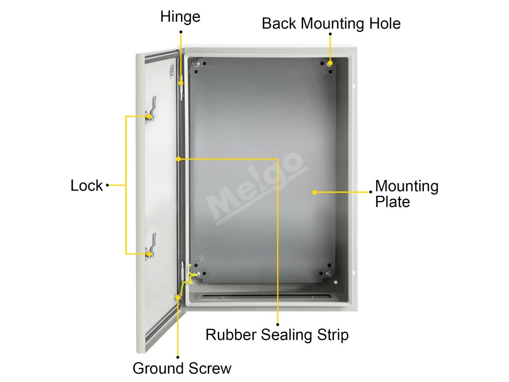 Odnímateľná pozinkovaná zadná doska s rozmermi 2 MM umožňuje jednoduchú inštaláciu dosiek plošných spojov, svoriek alebo iných elektrických komponentov, ktoré je potrebné upevniť. Na zadnej strane sa nachádzajú aj štyri montážne otvory na jednoduchú montáž na stenu.