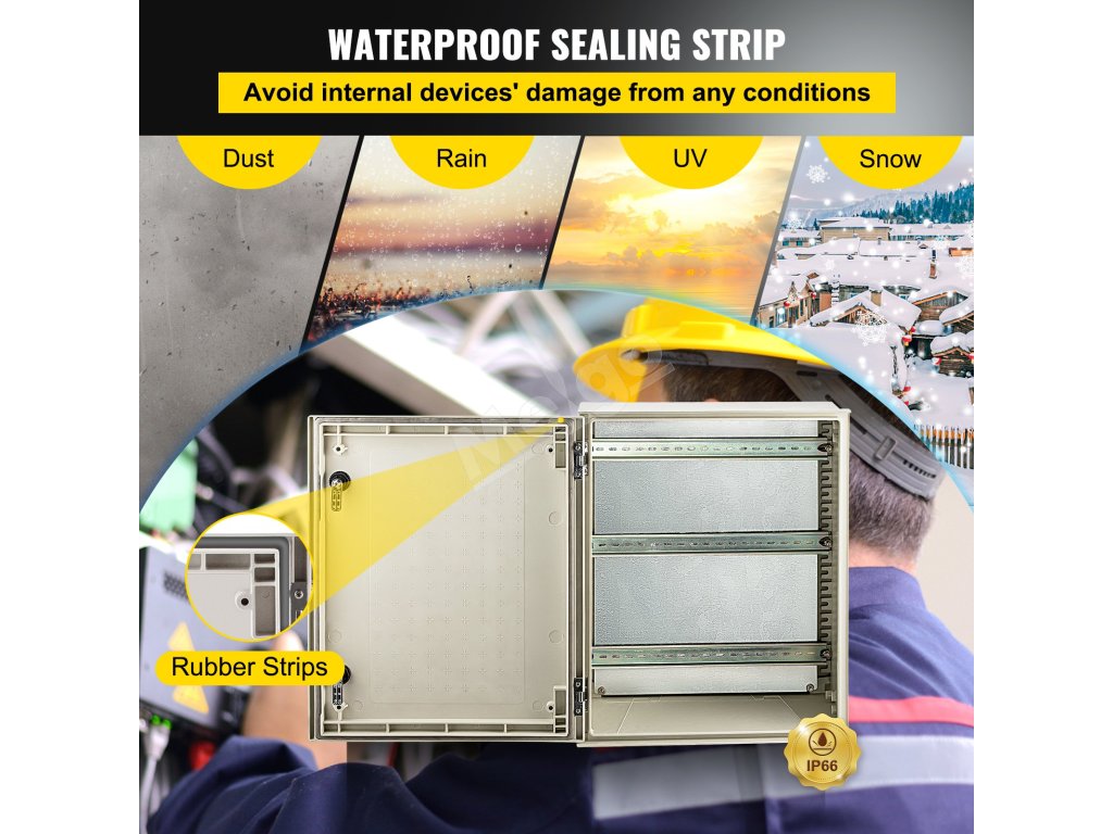 Skriňa VEVOR NEMA má stupeň vodotesnosti IP66. Toto hodnotenie zaručuje, že sa doň nedostane voda a prach. Kryt odolá náročným podmienkam. Je vhodný na vnútorné aj vonkajšie použitie. Konštrukcia zo sklených vlákien zvyšuje odolnosť. Poškodenie okolitým prostredím ho nevystaví. Klasifikácia NEMA 4X tohto krytu zaručuje optimálny výkon aj v extrémnych poveternostných podmienkach. Vaše elektrické komponenty zostanú v bezpečí. Kryt je ideálny pre solárne zostavy, ovládanie brán a vonkajšiu elektroniku.