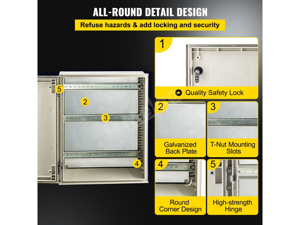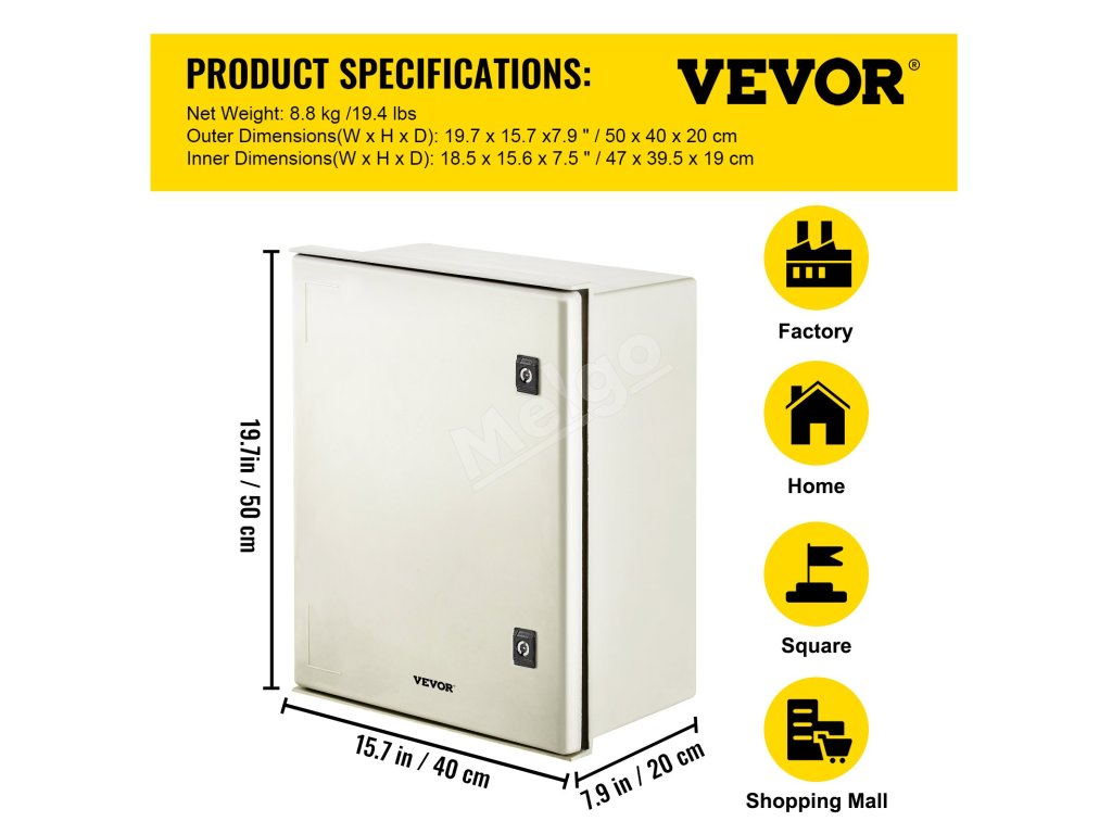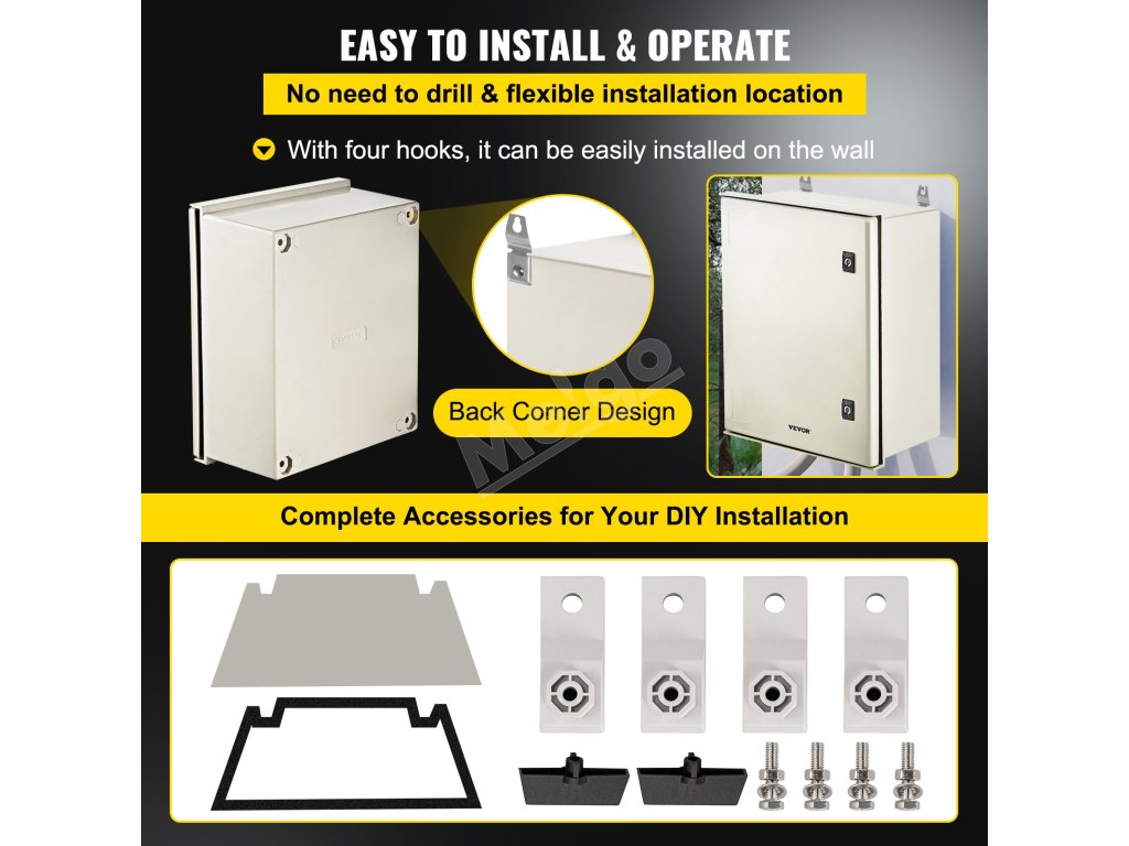 Nastavenie skrine VEVOR NEMA je jednoduché. Obsahuje namontovanú zadnú dosku pre jednoduchú inštaláciu. Vďaka dizajnu sa ľahko používa aj začiatočníkom. Profesionáli ocenia premyslené detaily. Zadná doska podporuje rôzne elektrické konfigurácie. Svoje komponenty v nej môžete rýchlo upevniť. Samotná skrinka má ľahko ovládateľné montážne body. Môžete ju bez problémov pripevniť na steny alebo iné povrchy. Vďaka tomu je zariadenie vhodné pre rôzne zostavy a aplikácie atď.