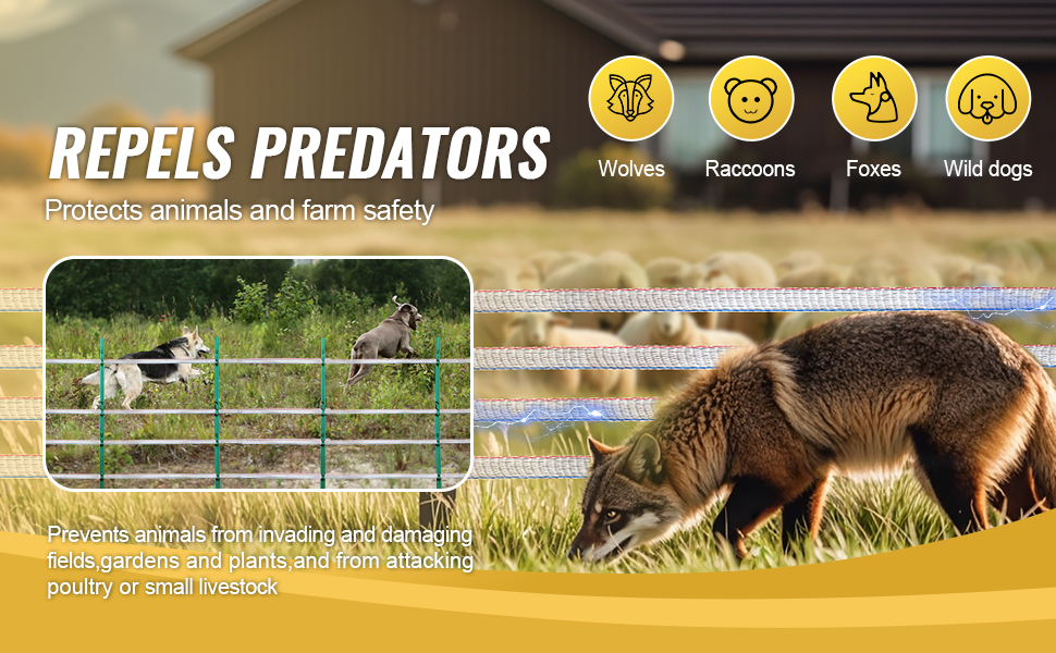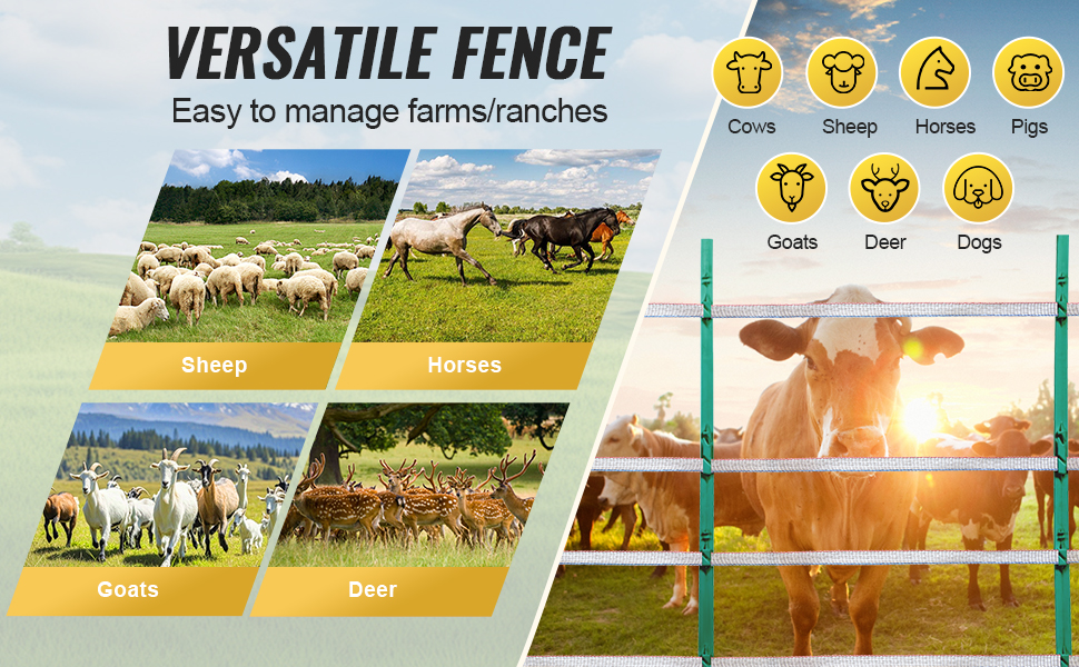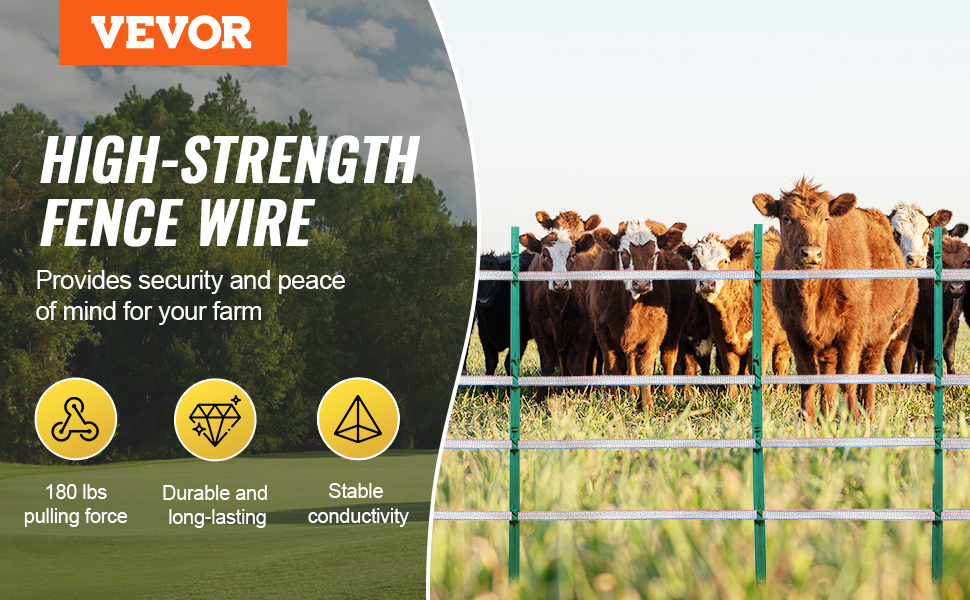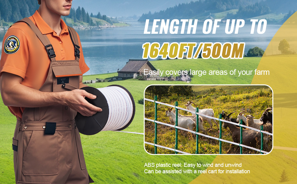 Vďaka dĺžke až 1640 stôp/500 m tento elektrický ohradník pre dobytok ľahko pokryje veľké plochy vašej farmy. Vďaka priloženému plastovému bubnu ABS je navíjanie a odvíjanie drôtu pohodlnejšie a pri inštalácii si môžete pomôcť vozíkom s bubnom, čo výrazne zvyšuje efektivitu.