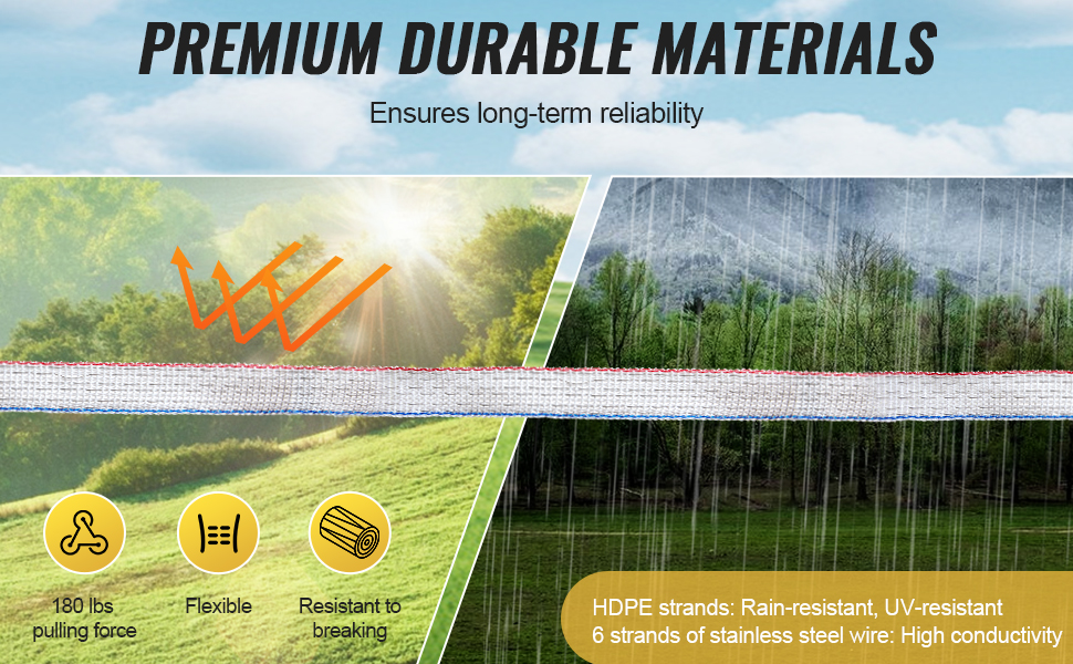 Tento vysoko viditeľný drôtený ohradník je vyrobený z vlákien HDPE a 6 vlákien drôtu z nehrdzavejúcej ocele, ktoré ponúkajú odolnosť voči dažďu a UV žiareniu. Jeho pružnosť a vysoká pevnosť v ťahu zaisťujú dlhodobú životnosť a odolnosť proti pretrhnutiu. Ušetrí vám náklady na častú výmenu a údržbu.