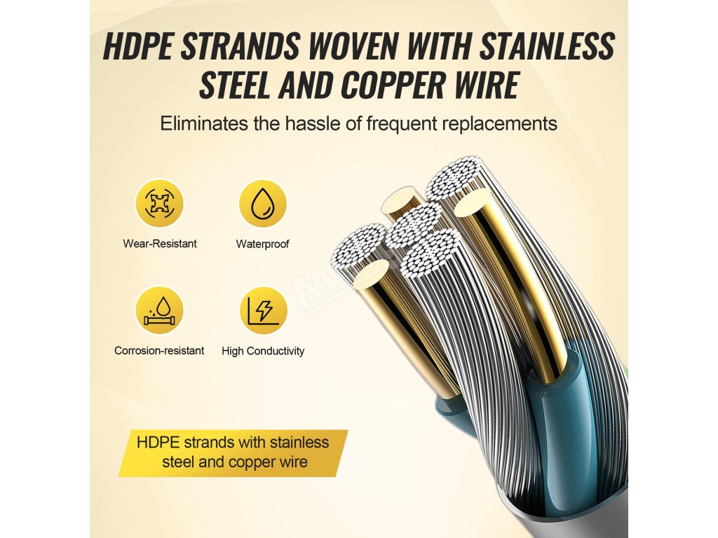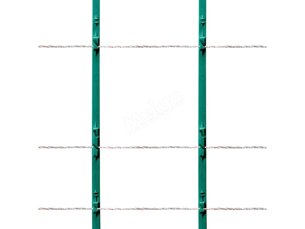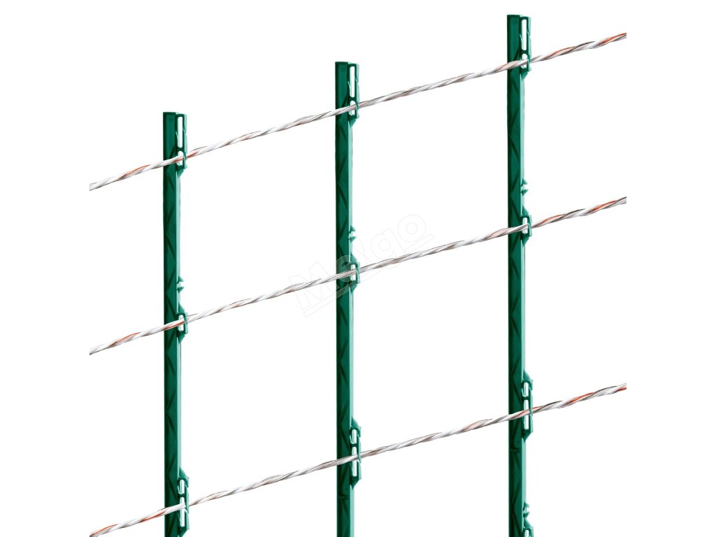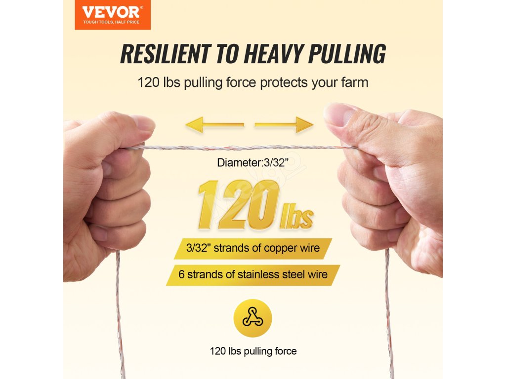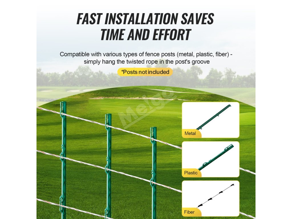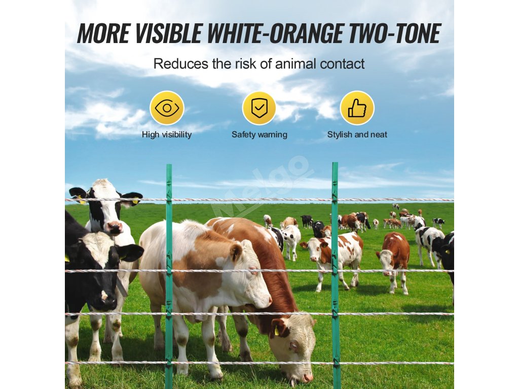 Tento vysoko viditeľný drôtený ohradník je vyrobený z vlákien HDPE, 6 vlákien drôtu z nehrdzavejúcej ocele a 3 vlákien medeného drôtu, ktoré ponúkajú odolnosť voči dažďu a UV žiareniu. Jeho pružnosť a vysoká pevnosť v ťahu zaisťujú dlhodobú životnosť a odolnosť proti pretrhnutiu.