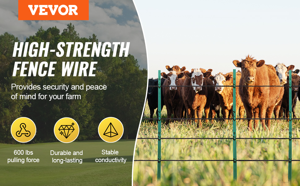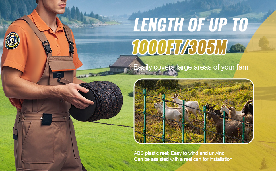 Vďaka dĺžke až 1000 stôp/305 m tento elektrický ohradník pre dobytok ľahko pokryje veľké plochy vašej farmy. Vďaka priloženému plastovému bubnu ABS je navíjanie a odvíjanie drôtu pohodlnejšie a pri inštalácii si môžete pomôcť vozíkom s bubnom, čo výrazne zvyšuje efektivitu.