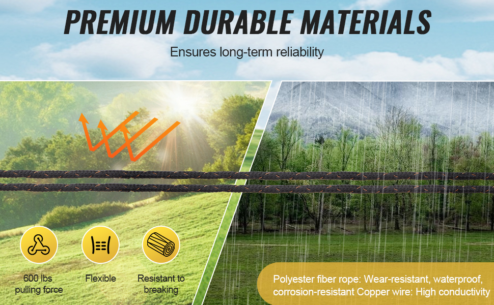 Tento vysoko viditeľný drôtený ohradník je vyrobený z lana z polyesterových vlákien a 2 prameňov medeného drôtu, ktorý ponúka odolnosť voči dažďu a UV žiareniu. Jeho pružnosť a vysoká pevnosť v ťahu zaisťujú dlhodobú životnosť a odolnosť voči pretrhnutiu. Ušetrí vám náklady na časté výmeny a údržbu.