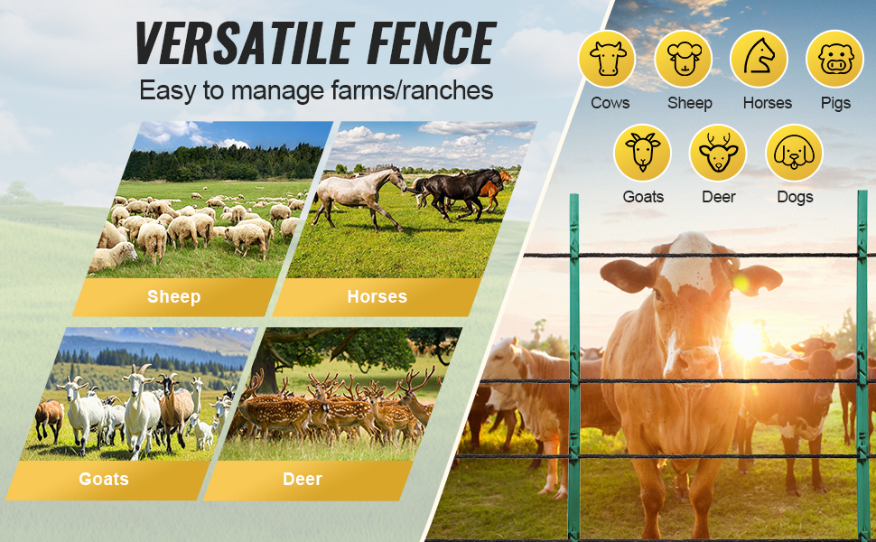 Náš multifunkčný prenosný ohradníkový drôt je vhodný pre rôzne hospodárske zvieratá vrátane hovädzieho dobytka, oviec, koní, ošípaných, kôz, jeleňov a psov. Efektívnym riadením impulzného prúdu môžete ľahko kontrolovať rozsah pohybu hospodárskych zvierat, zabezpečiť ich bezpečnosť a zabrániť útekom.