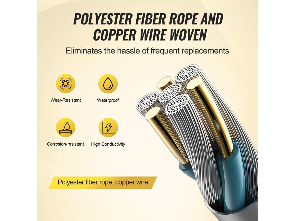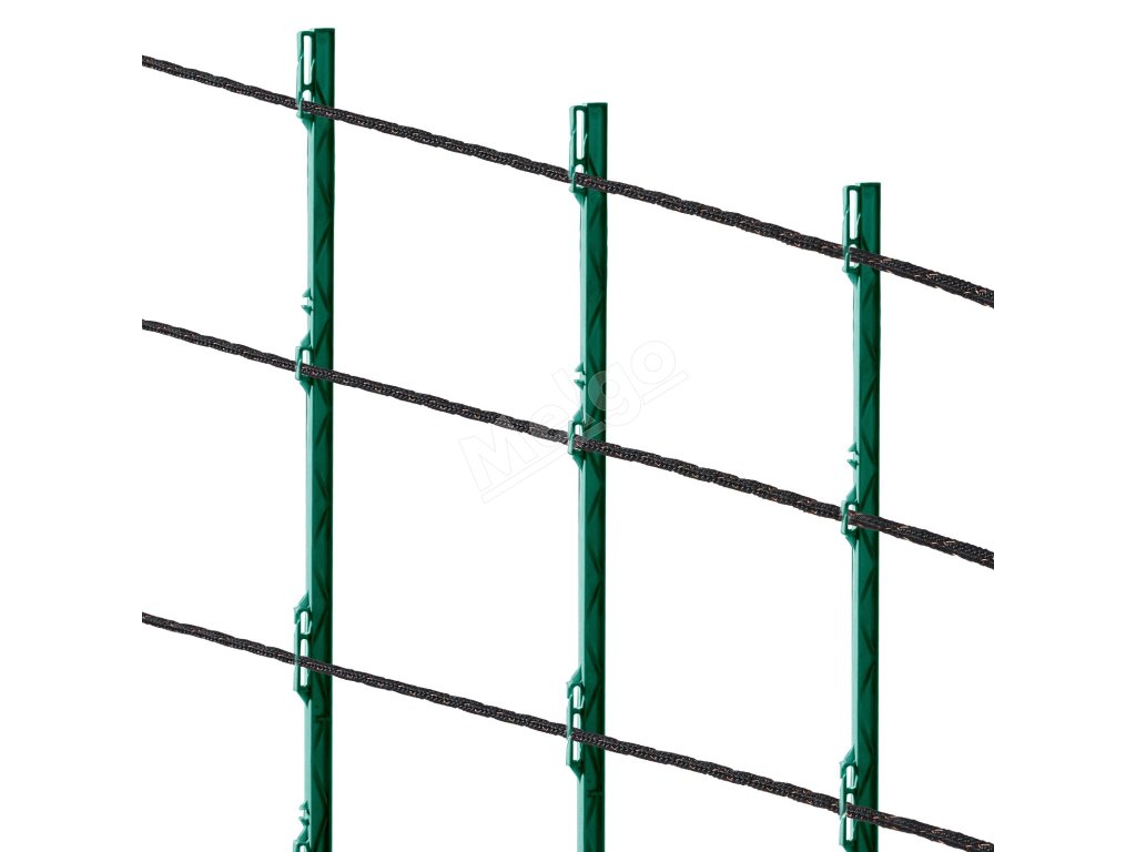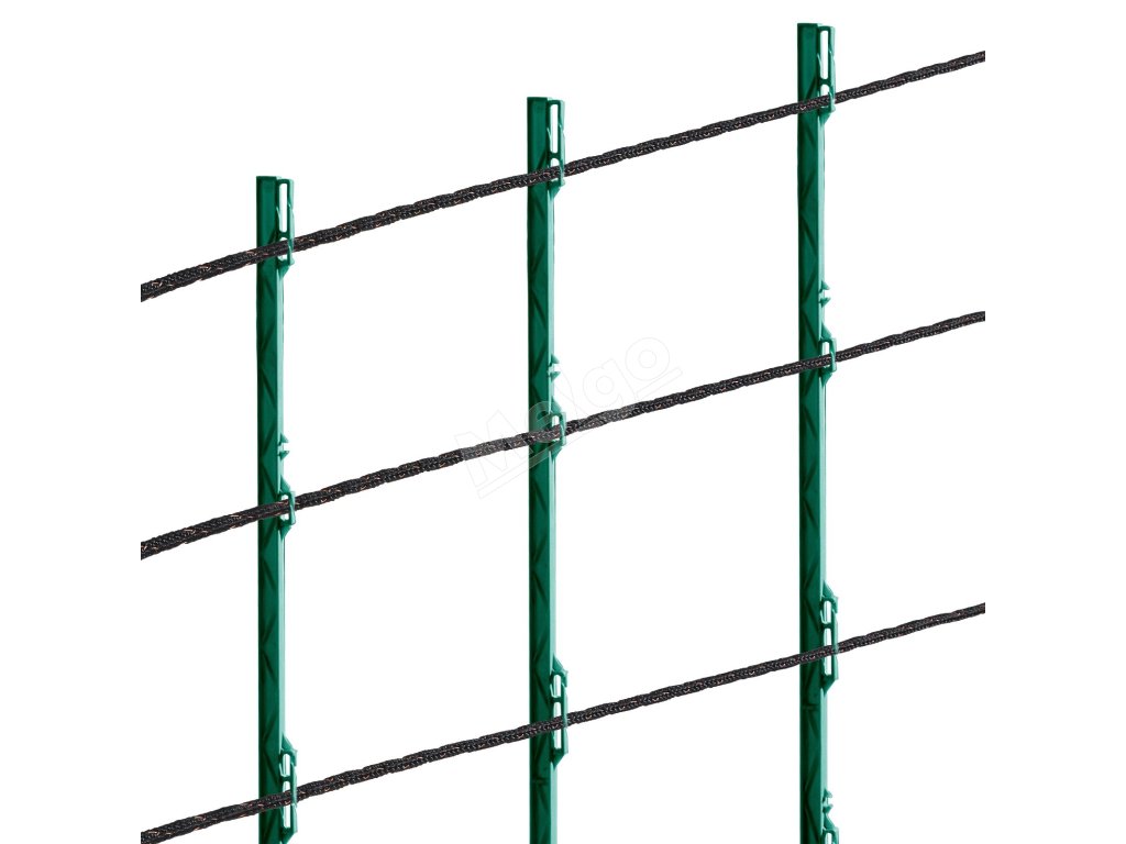 Tento vysoko viditeľný drôtený ohradník je vyrobený z lana z polyesterových vlákien a 2 prameňov medeného drôtu, ktorý ponúka odolnosť voči dažďu a UV žiareniu. Jeho pružnosť a vysoká pevnosť v ťahu zaisťujú dlhodobú životnosť a odolnosť voči pretrhnutiu. Ušetrí vám náklady na časté výmeny a údržbu.