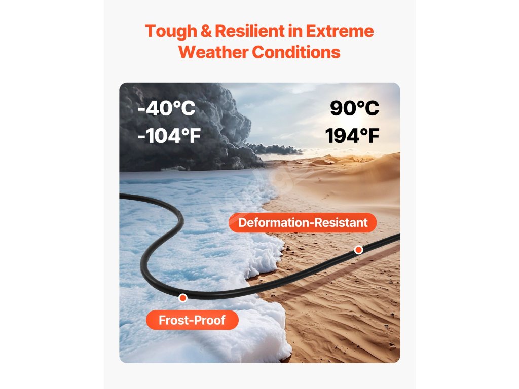 Vďaka plášťu CPE odolnému voči chemickej korózii tento elektrický predlžovací kábel zabraňuje zamrznutiu pri teplote -40 ℃/-104℉ a zmäknutiu pri teplote 90 ℃/194℉. Jeho konštrukcia odolná voči tlaku, výbuchu a plameňom je vhodná do drsných prostredí, ako sú továrne, a poskytuje bezpečné používanie energie.