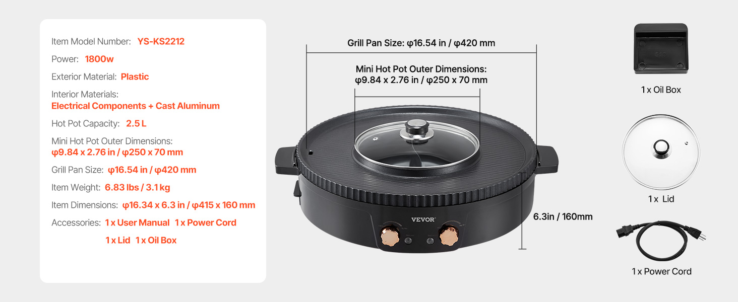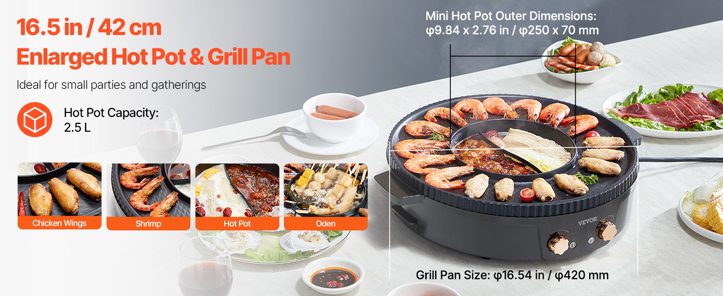 Naša kombinácia horúceho hrnca a grilu s objemom 2,5 l obsahuje horúci hrniec s vonkajším priemerom φ9,84 x 2,76 palca ( φ250 x 70 mm) a grilovaciu panvicu φ16,54 palca (φ420 mm), takže je dostatočne veľká na prípravu plnohodnotného jedla s rodinou a priateľmi.