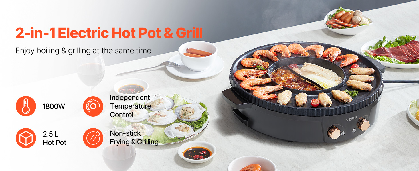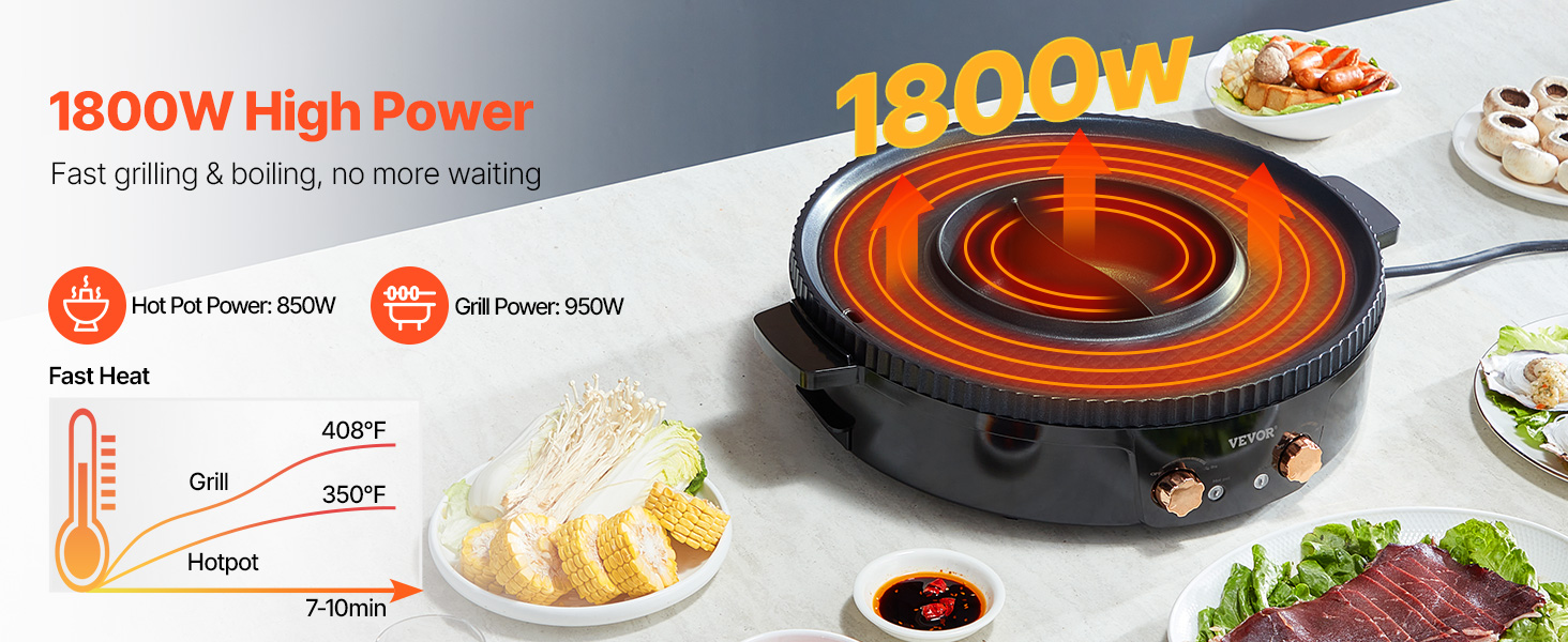 Zhromaždite svojich priateľov bez čakania. Vďaka vysokému príkonu 1800 W sa náš horúci hrniec s grilom rýchlo zohreje, čo vám umožní v okamihu začať pripravovať jedlo, či už grilujete, alebo varíte.