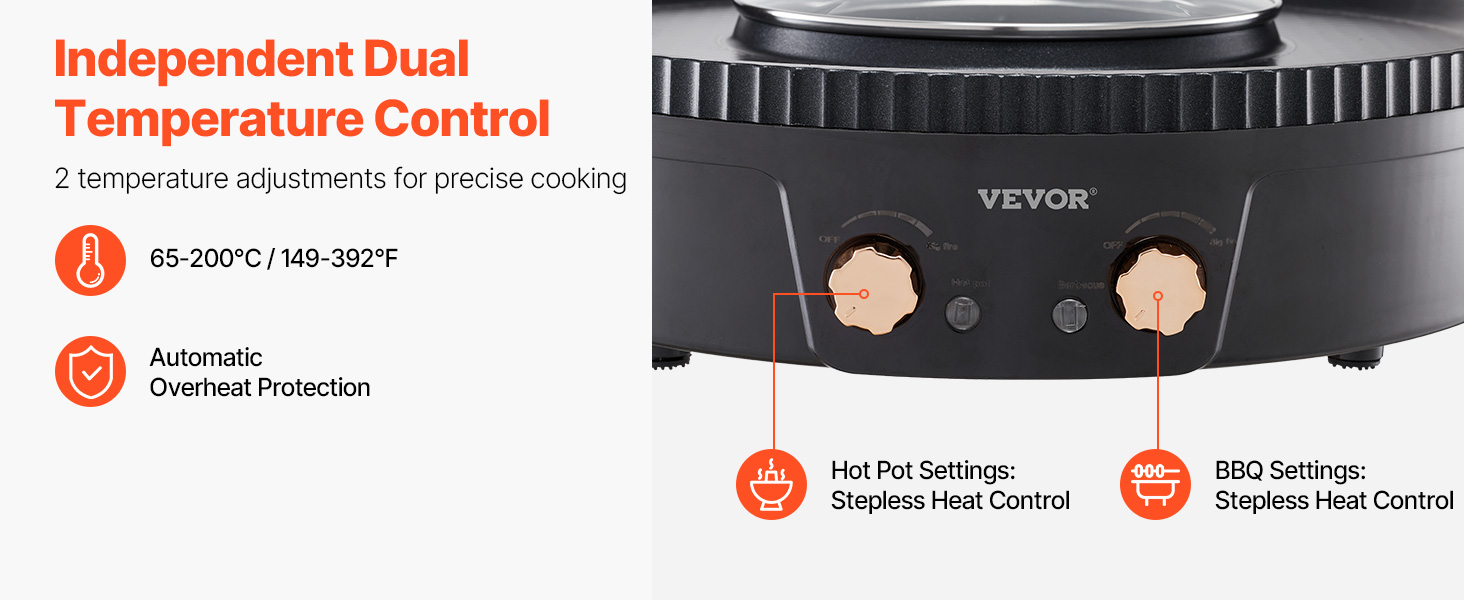 Náš elektrický hrniec s horúcim hrncom a grilom prináša dve zóny s gombíkmi na samostatné a presné nastavenie tepla. Bez námahy riadi nízky a vysoký ohrev, čím zabezpečuje, že nedochádza k vzájomnému rušeniu a poskytuje vám úplnú kontrolu pre lahodné výsledky varenia.