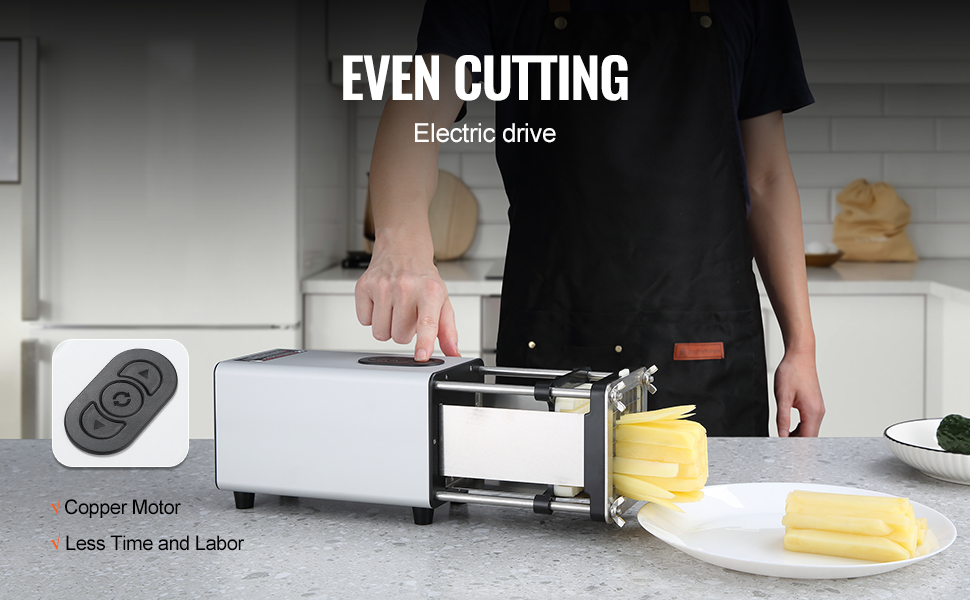 Tento elektrický krájač na hranolky má režim ovládania pomocou tlačidla. Má funkcie zatlačenia dopredu, návratu a automatického cyklu, ktoré sa ľahko ovládajú a rovnomerne krájajú potraviny.