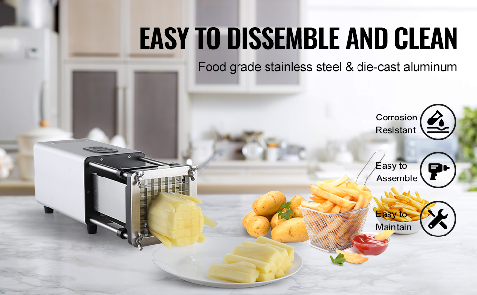 Tento krájač na hranolčeky je vyrobený z odolnej nehrdzavejúcej ocele a hliníka, takže je trvanlivý a odolný voči korózii. Čepele z nehrdzavejúcej ocele sa dajú odpojiť na čistenie, čo uľahčuje údržbu celého zariadenia a predlžuje jeho životnosť.