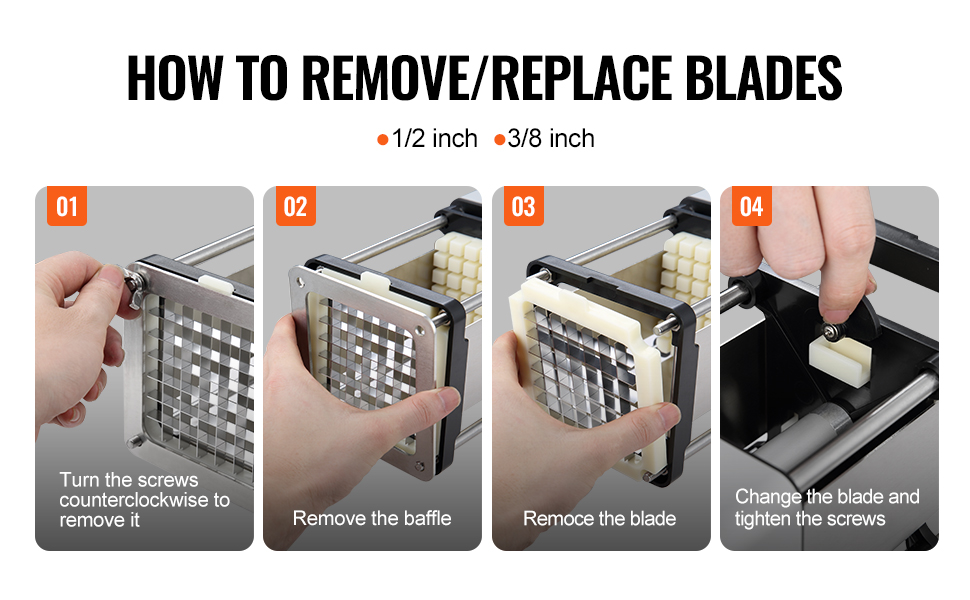 Krájač na hranolky je vybavený modernizovanými 1/2" a 3/8" čepeľami z potravinárskej nehrdzavejúcej ocele SUS420J2, ktoré sa ľahko vymieňajú a čistia.