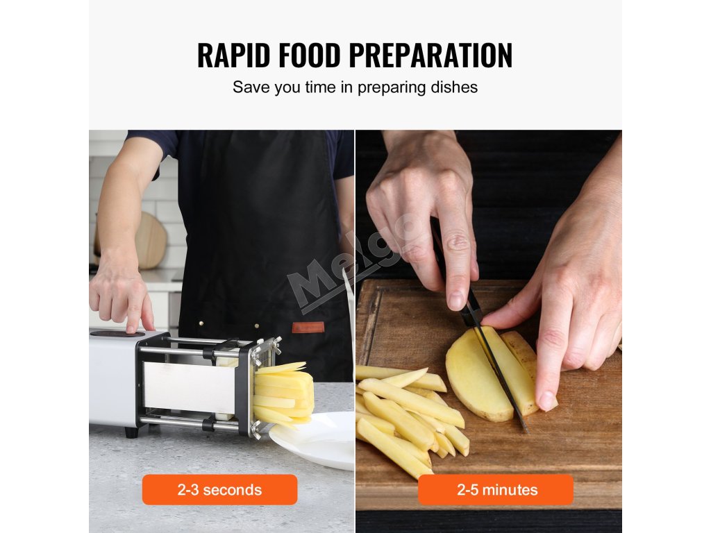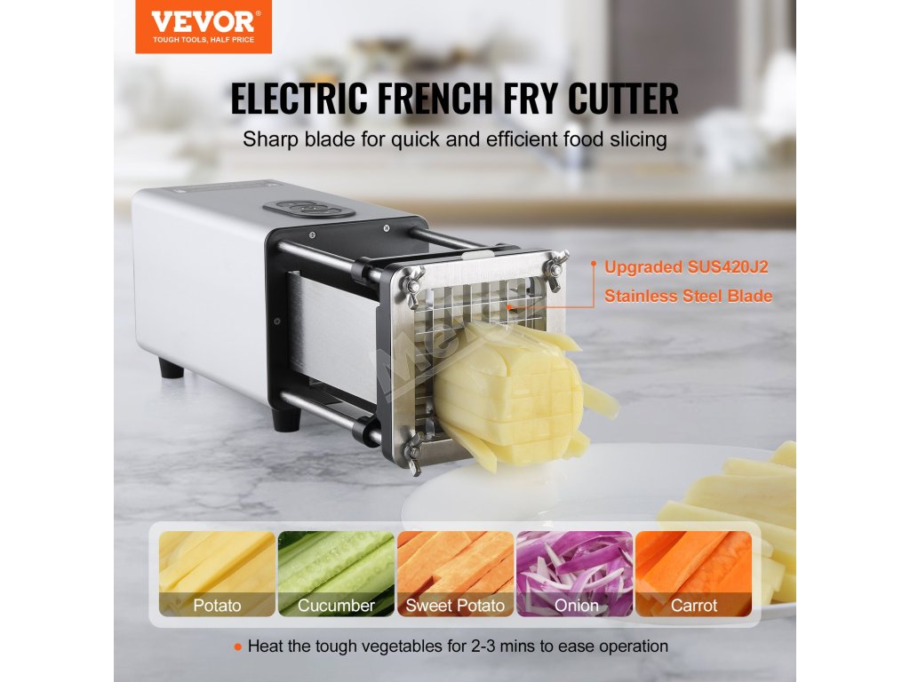 Krájač na hranolky VEVOR je vybavený ostrými čepeľami z nehrdzavejúcej ocele a protišmykovými nožičkami na zvýšenie stability. Bez námahy s ním nakrájate zeleninu, ako sú zemiaky, mrkva, uhorky, a dokonca aj tvrdšie druhy, napríklad sladké zemiaky.