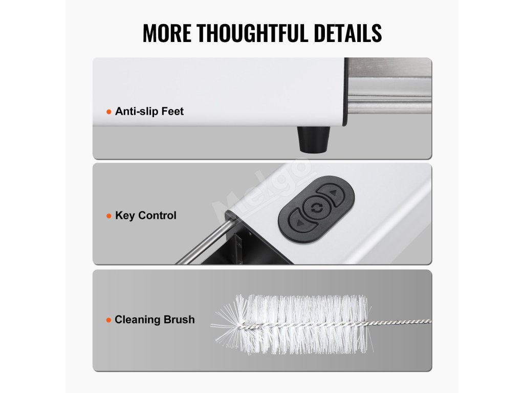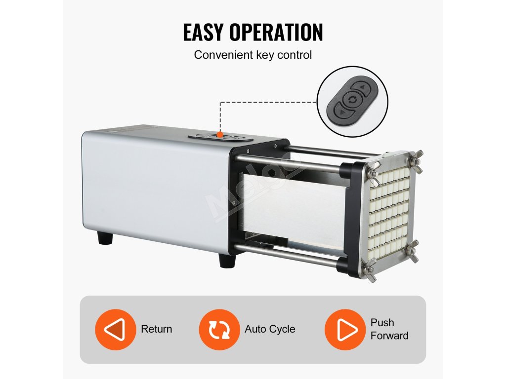 Tento elektrický krájač na hranolky má režim ovládania pomocou tlačidla. Má funkcie zatlačenia dopredu, návratu a automatického cyklu, ktoré sa ľahko ovládajú a rovnomerne krájajú potraviny.