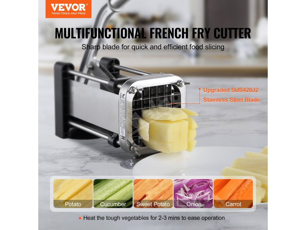 Krájač na hranolky je vybavený vylepšeným 1/2-palcovým nožom z potravinárskej nehrdzavejúcej ocele SUS420J2. Páka s protišmykovou rukoväťou s pákovým mechanizmom, navrhnutá ergonomicky, umožňuje krájanie potravín bez námahy, čím šetrí vašu energiu a čas.
