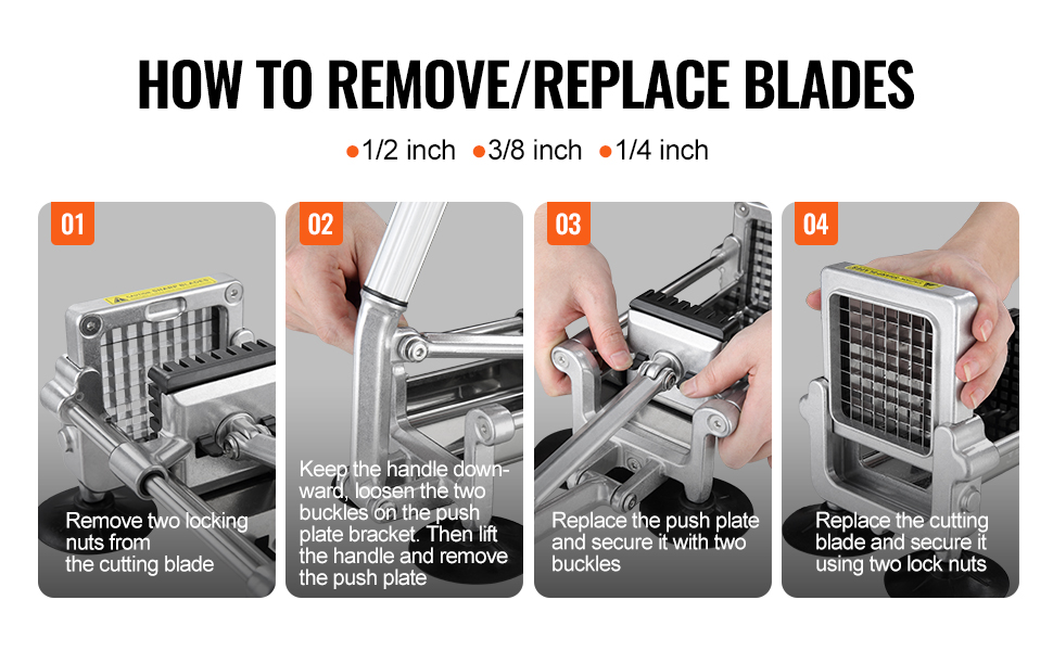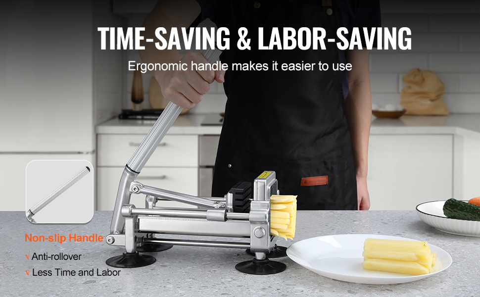 Krájač na hranolky je vybavený modernizovanými čepeľami z potravinárskej nehrdzavejúcej ocele SUS420J2 s priemerom 1/2 palca, 3/8 palca a 1/4 palca. Páka s protišmykovou rukoväťou s pákovým mechanizmom, navrhnutá ergonomicky, umožňuje krájanie potravín bez námahy, čím šetrí vašu energiu a čas.