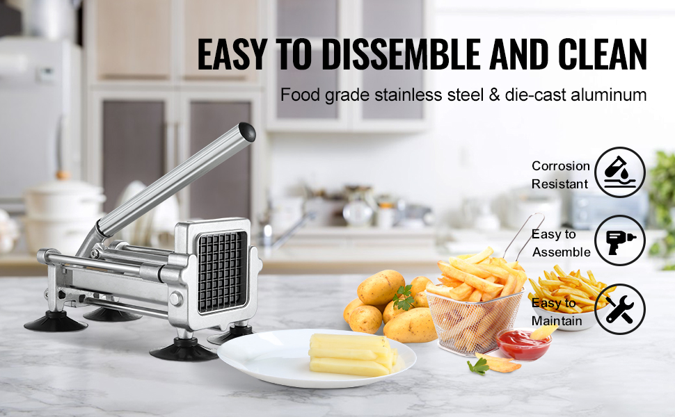 Tento krájač na hranolky je vyrobený z odolnej nehrdzavejúcej ocele a hliníka, je trvanlivý a odolný voči korózii. Čepele z nehrdzavejúcej ocele sa dajú oddeliť na čistenie, čo uľahčuje údržbu celého zariadenia a predlžuje jeho životnosť.