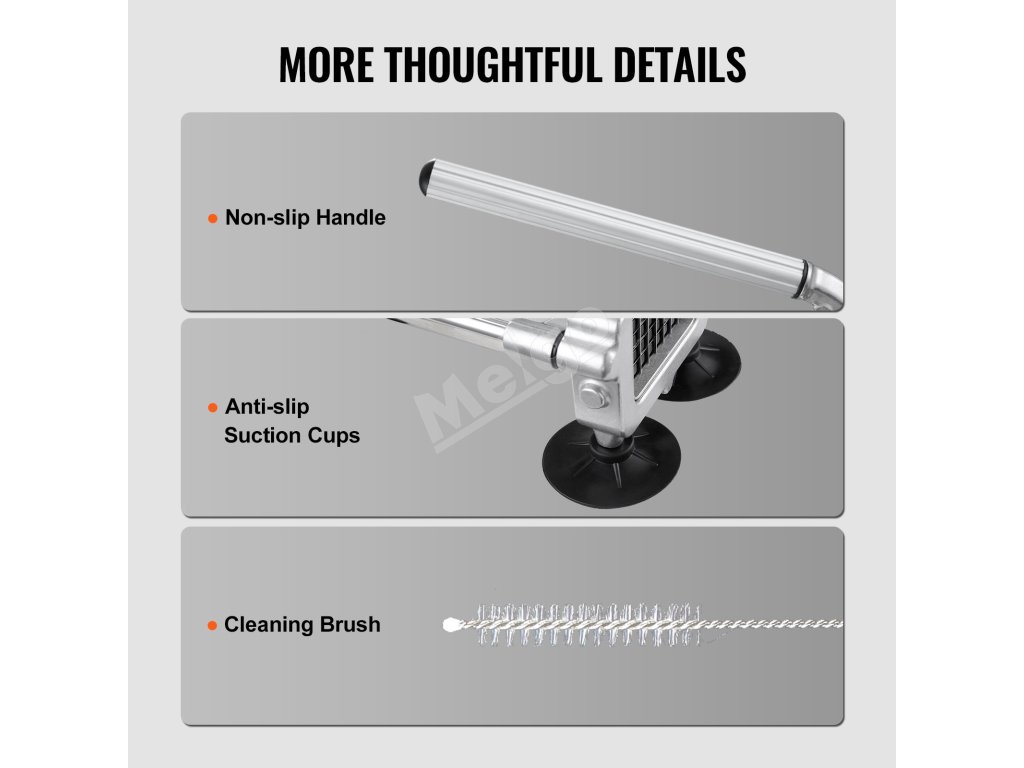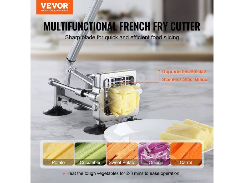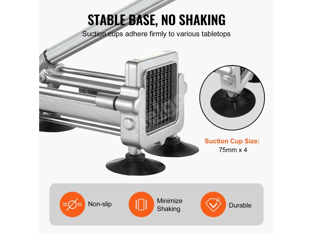 Vybavený ostrými čepeľami a ergonomickou pákou so 4 prísavnými protišmykovými nožičkami pre lepšiu stabilitu. Výkonné odsávanie zaisťuje odolnosť proti pošmyknutiu počas prevádzky. Dokáže bez námahy krájať zeleninu, ako sú zemiaky, mrkva, uhorky, a dokonca aj tvrdšie druhy, ako sú sladké zemiaky.