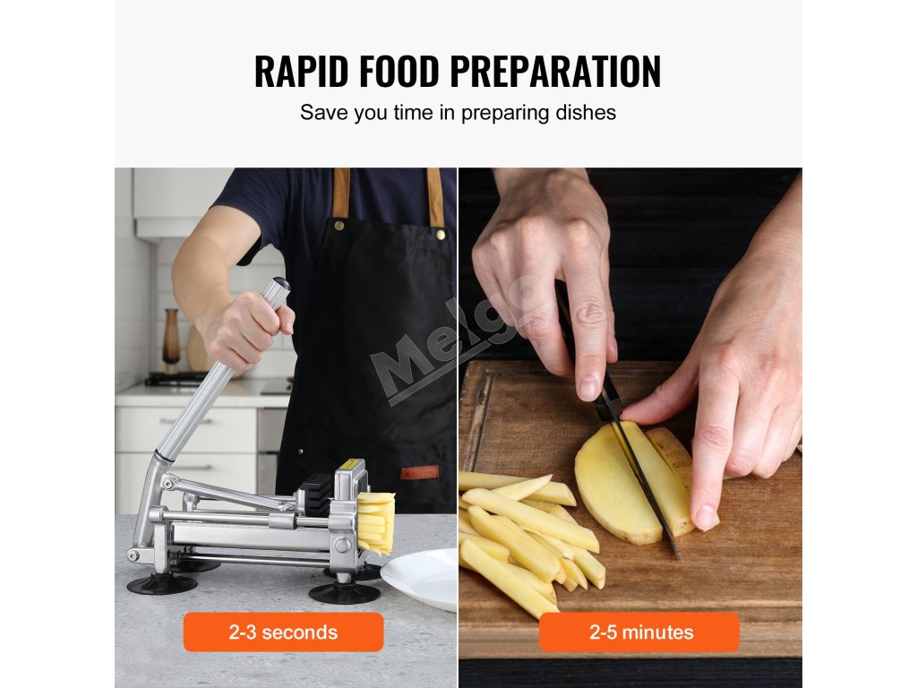 Krájač na hranolky je vybavený modernizovanými čepeľami z potravinárskej nehrdzavejúcej ocele SUS420J2 s priemerom 1/2 palca, 3/8 palca a 1/4 palca. Páka s protišmykovou rukoväťou s pákovým mechanizmom, navrhnutá ergonomicky, umožňuje krájanie potravín bez námahy, čím šetrí vašu energiu a čas.