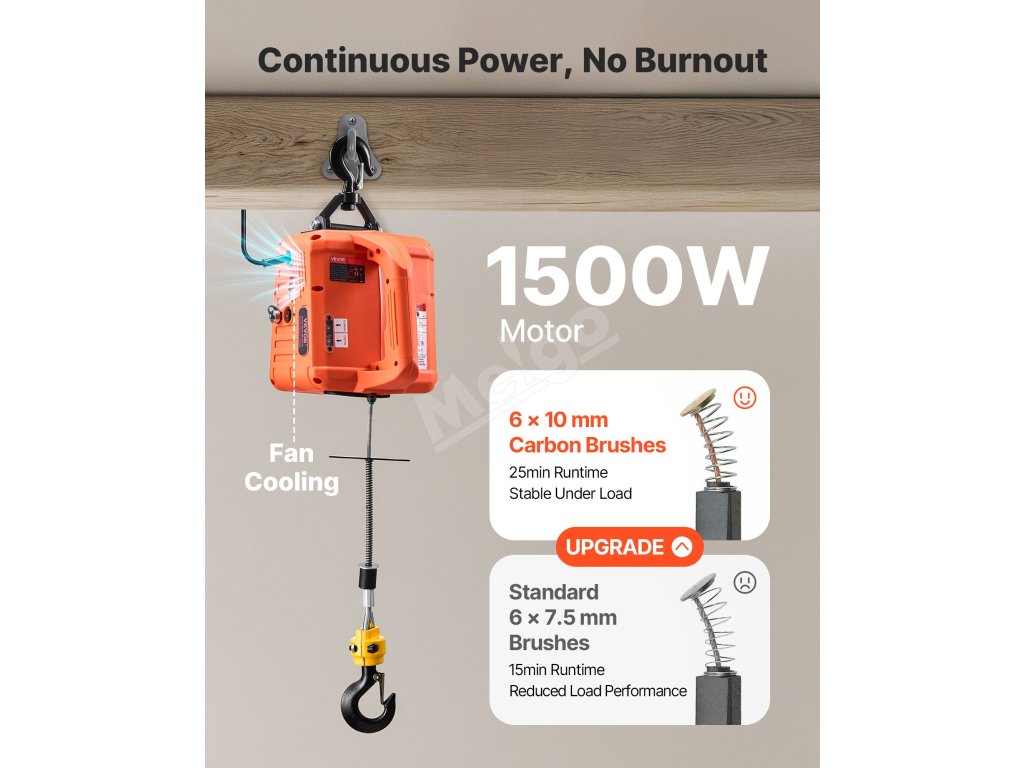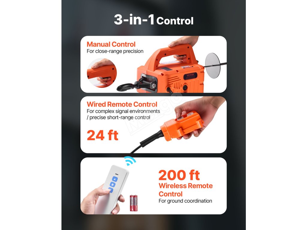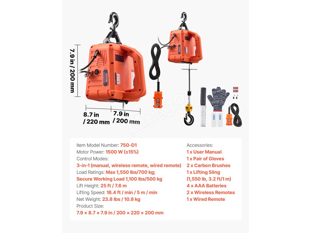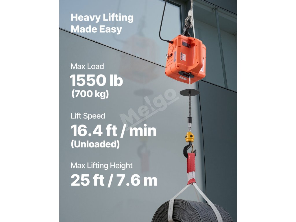 Náš prenosný elektrický kladkostroj má 1500W motor a zvládne až 1 550 lb. Zdvíha do výšky 25 ft rýchlosťou až 16,4 ft/min. ovládanie 3 v 1 pokrýva manuálne, 24 ft káblové a 200 ft bezdrôtové ovládanie. Dvojité bezpečnostné brzdenie sa zastaví pri strate napájania. Zdvíha alebo ťahá pre domácnosti, pracoviská, obchody a farmy.