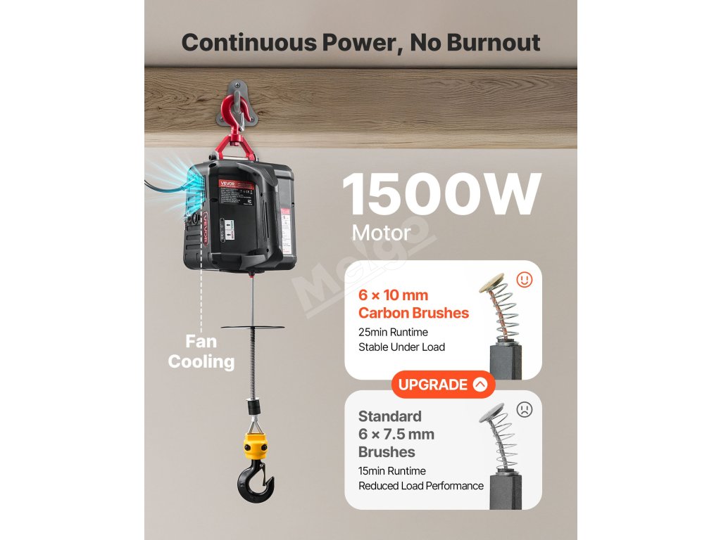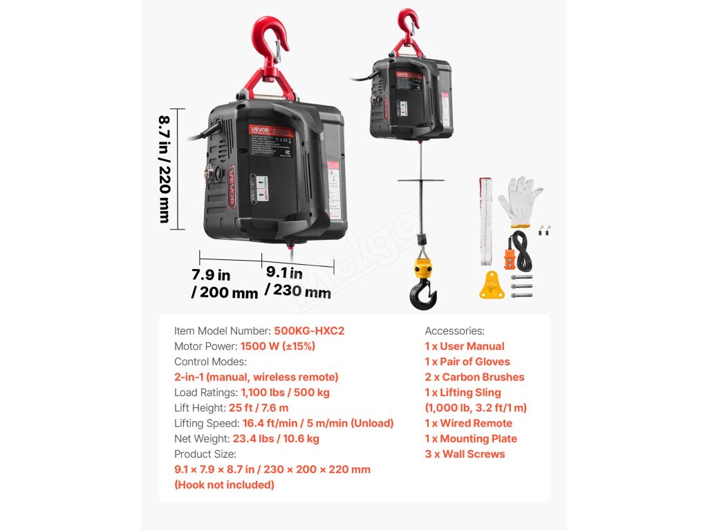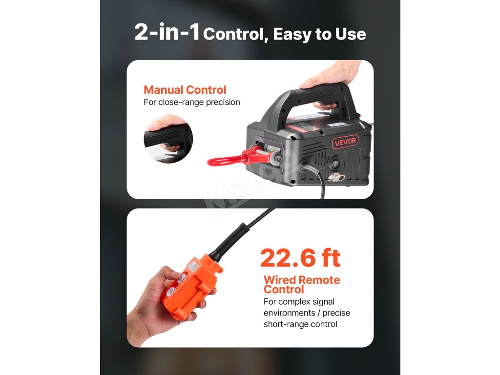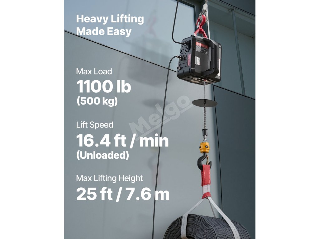 Prenosný elektrický navijak s 1500W motorom zdvihne až 1 100 lb do výšky 25 ft rýchlosťou až 16,4 ft/min. ovládanie 2 v 1 umožňuje používať tlačidlá na rukoväti alebo káblový diaľkový ovládač s výškou 22,6 ft. Dvojité bezpečnostné brzdenie sa zastaví pri strate napájania. Zvládne vertikálne zdvíhanie a horizontálne ťahanie pre domácnosti, pracoviská, obchody a farmy.
