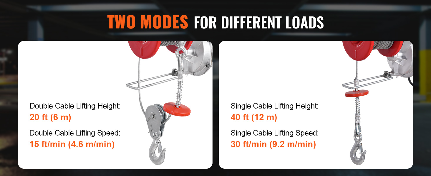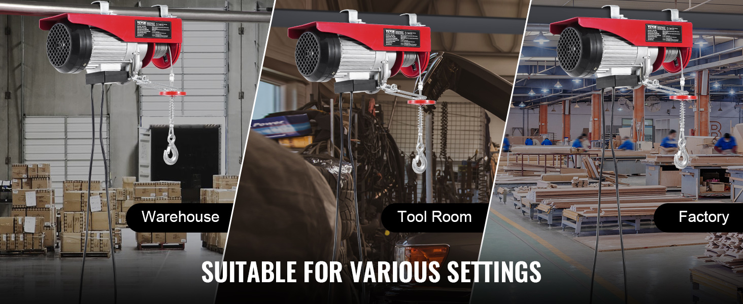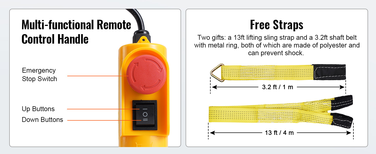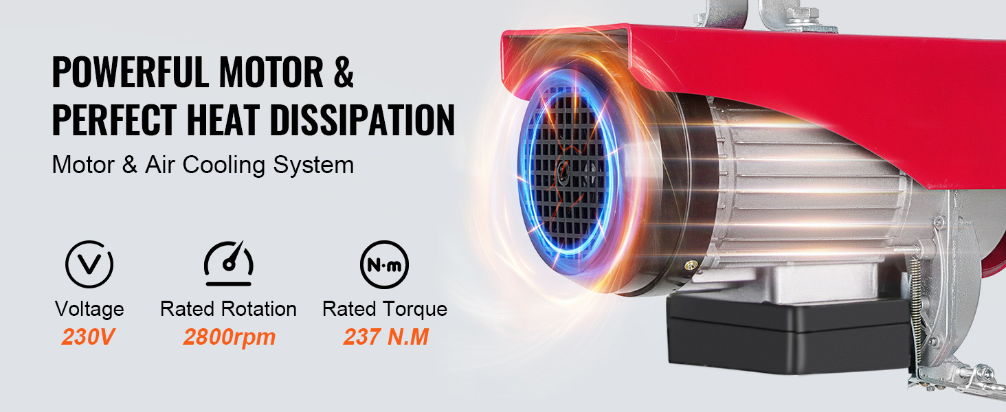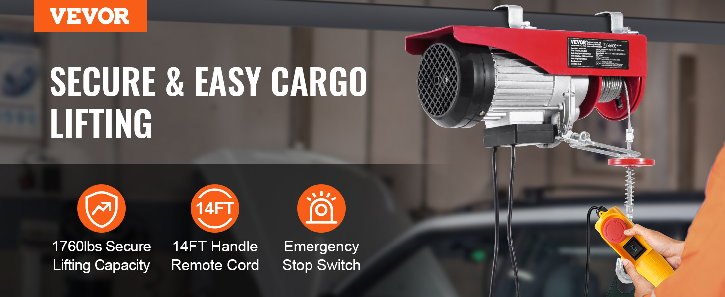 VEVOR, váš exkluzívny expert na náradie. Tento elektrický kladkostroj je vybavený motorom z čistej medi, ktorý poskytuje veľkú nosnosť na zdvíhanie ťažkých predmetov. Predĺžený drôtový kábel s dĺžkou 14 stôp vám umožňuje ovládať kladkostroj v bezpečnom priestore.