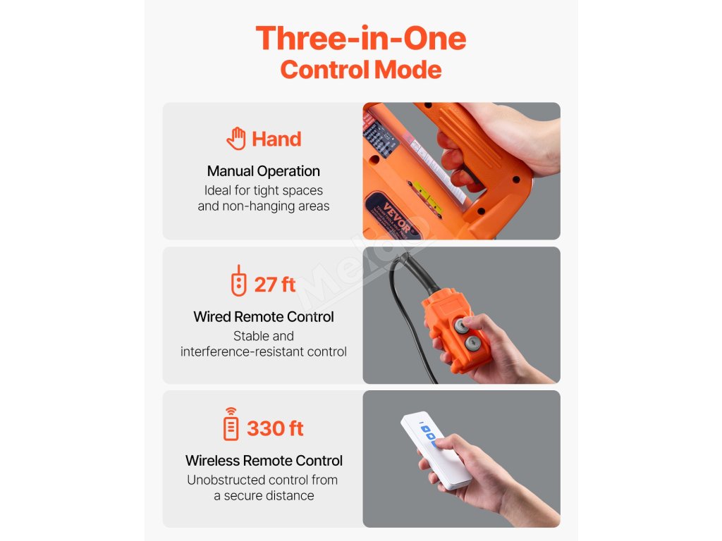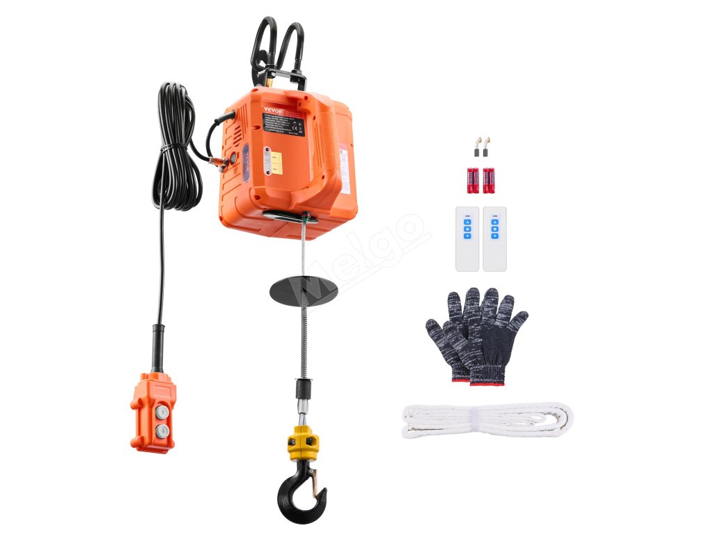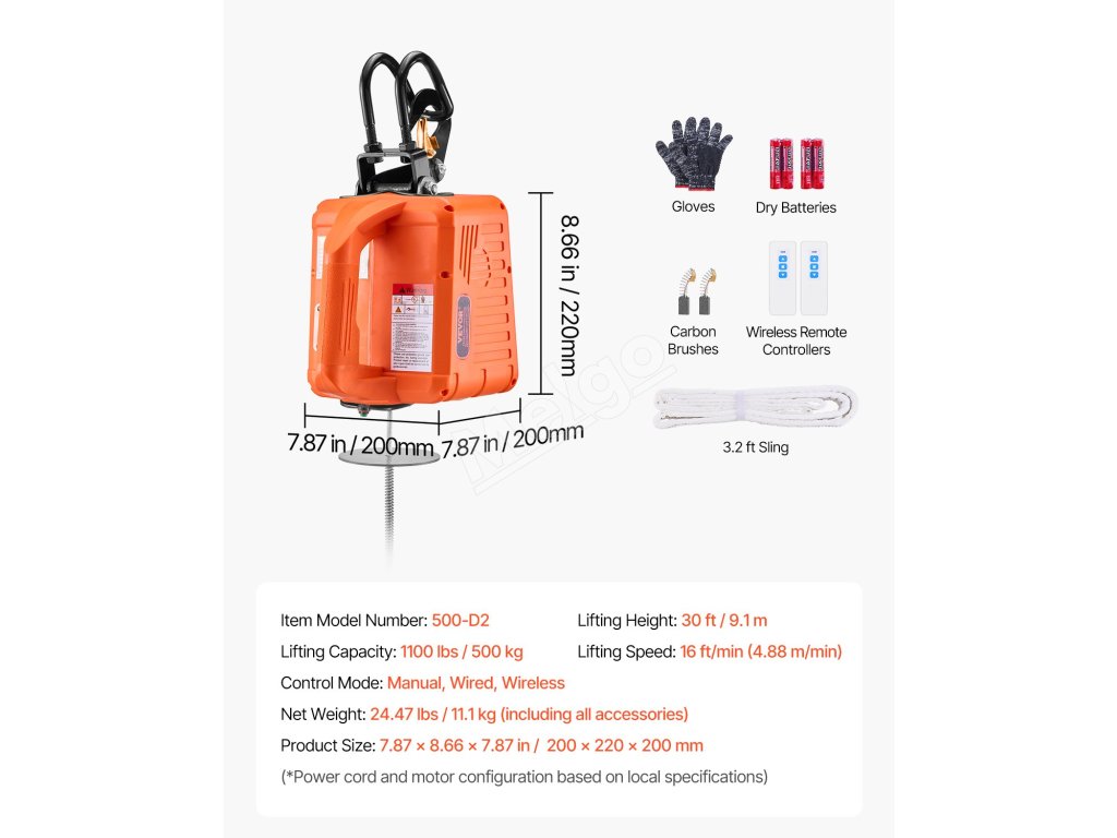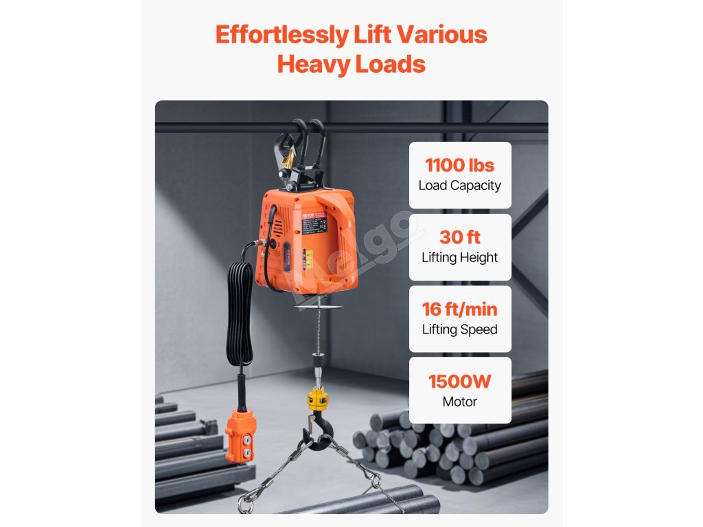 Tento prenosný elektrický kladkostroj má 1500W motor, nosnosť 1100 libier / 500 kg a výšku zdvihu až 30 stôp / 9,1 m. Ponúka manuálne, káblové (27 stôp) a bezdrôtové (330 stôp) ovládanie. Dvojitý 2,2-palcový hák zabezpečuje stabilitu pri rôznych úlohách.