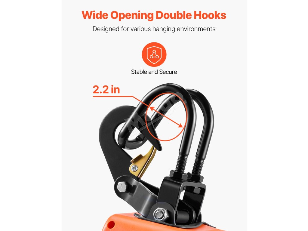 Konštrukcia s dvojitým hákom nášho prenosného kladkostroja zaručuje stabilitu a bezpečnosť, takže sa už nemusíte obávať zdvíhania ťažkých predmetov.