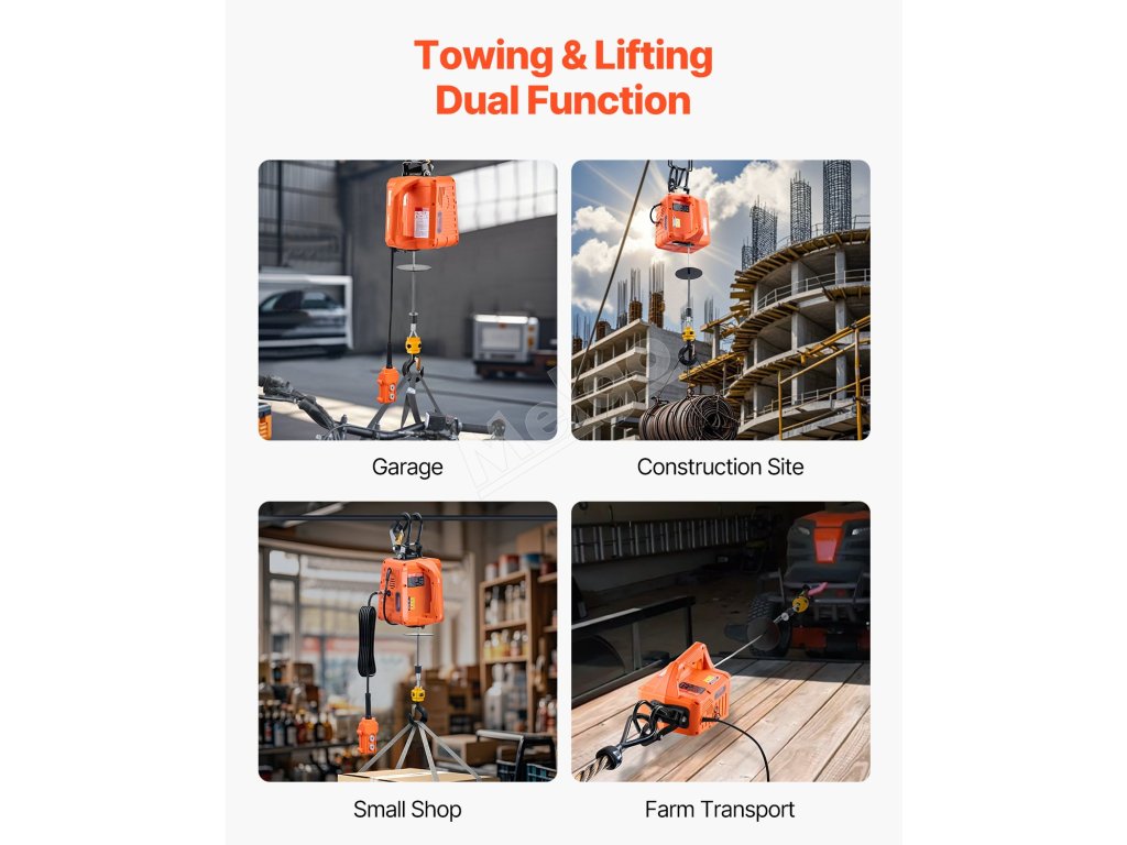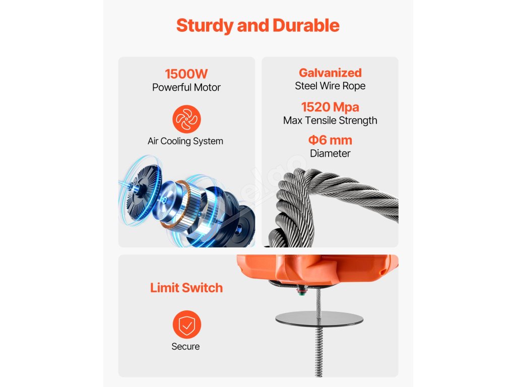Vďaka 1500W motoru a vysokopevnostným materiálom dokáže tento prenosný elektrický kladkostroj ľahko zdvíhať ťažké predmety, čím výrazne zvyšuje efektivitu práce.