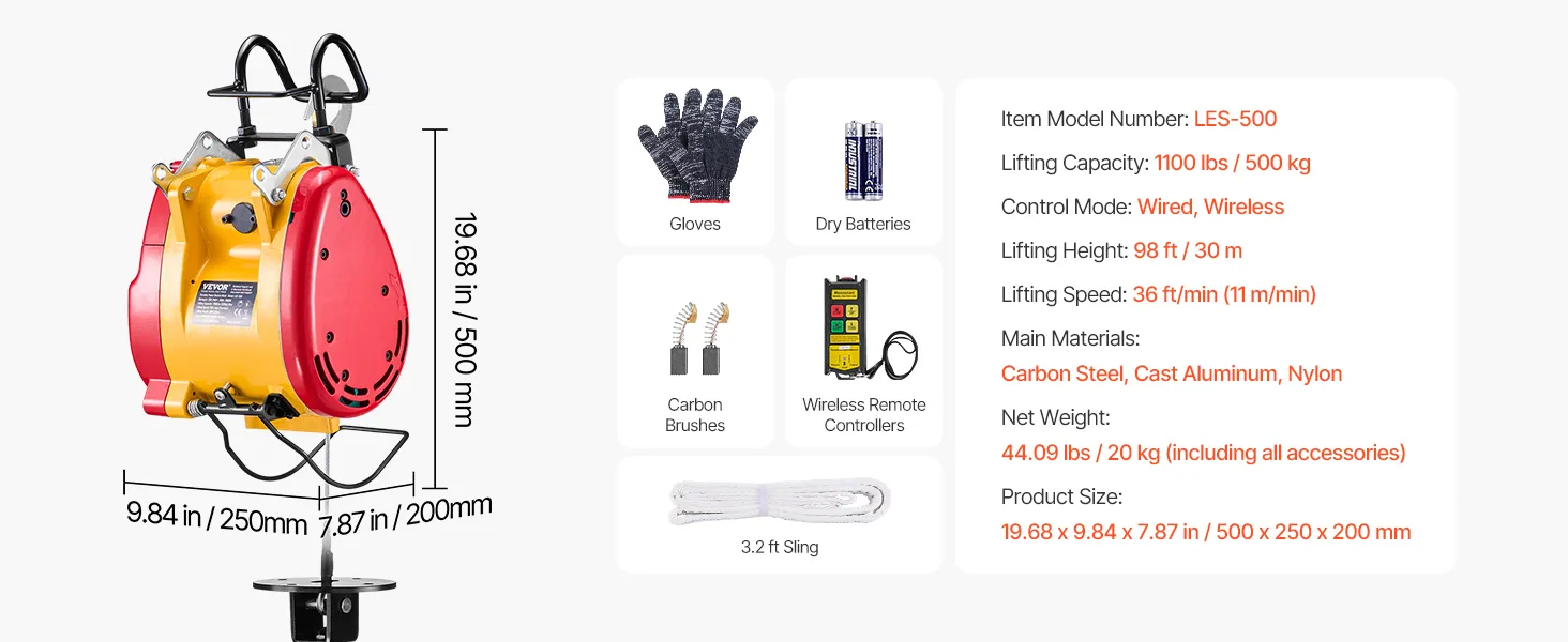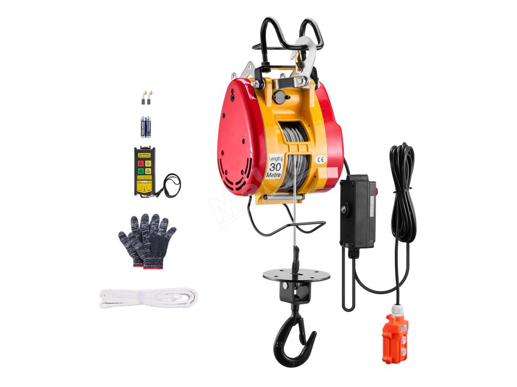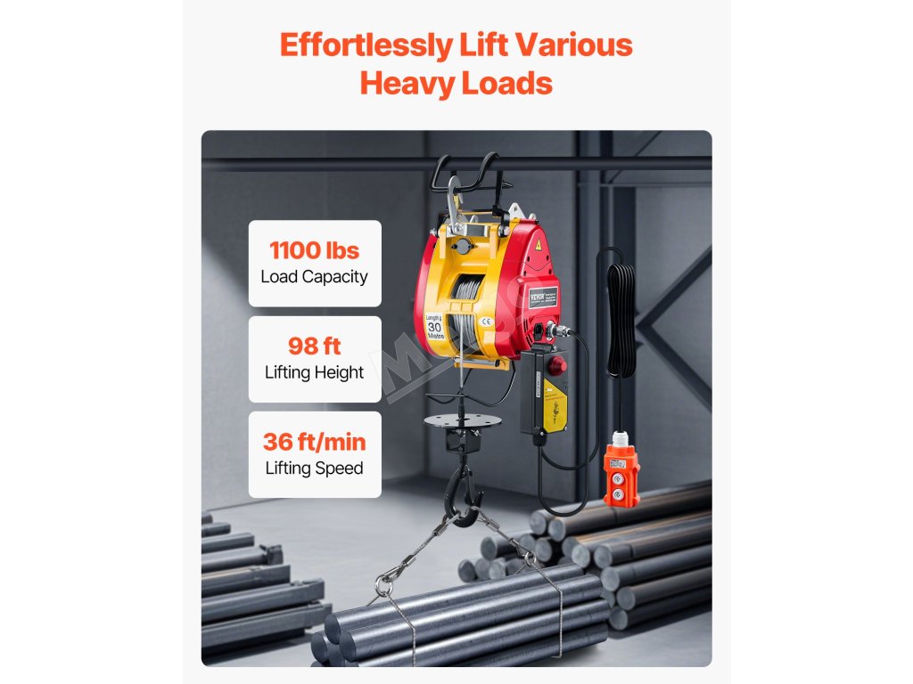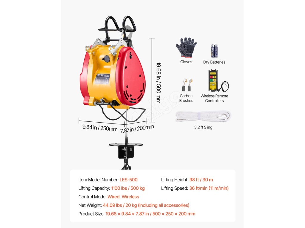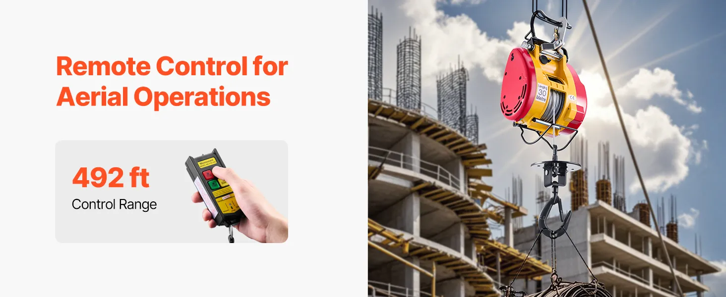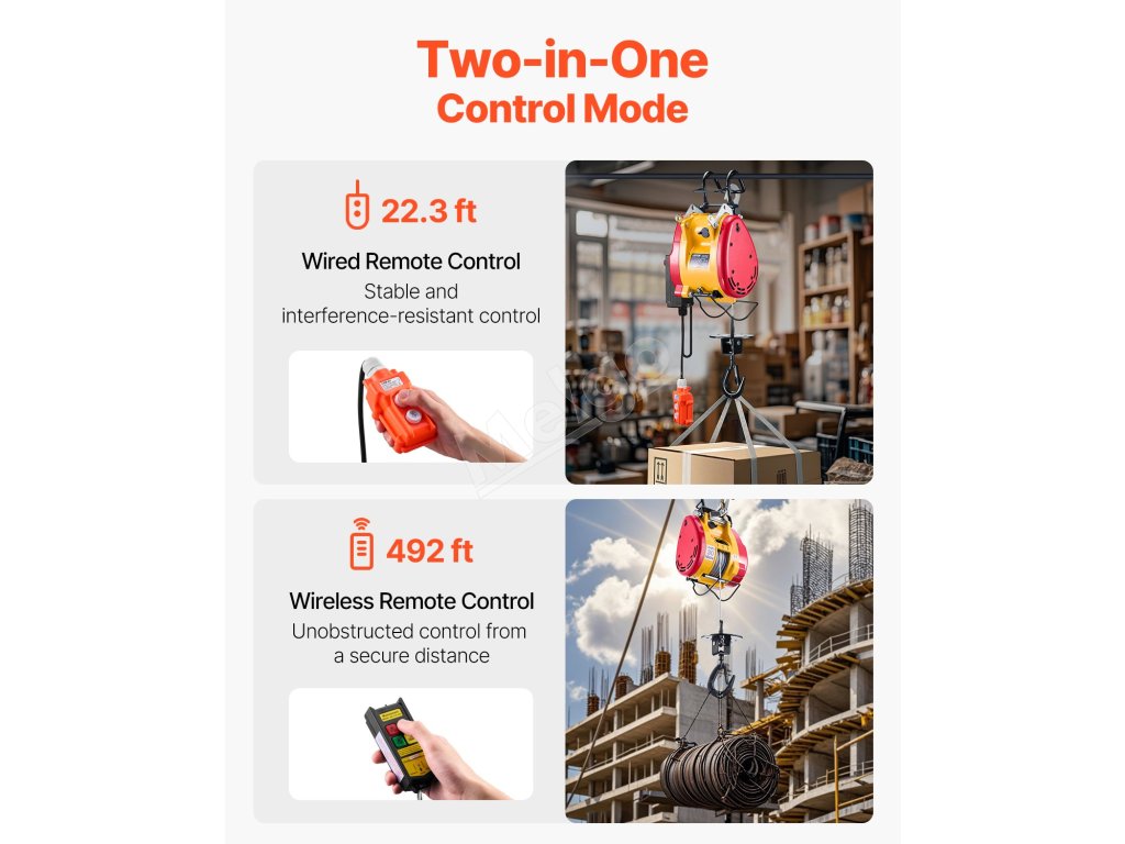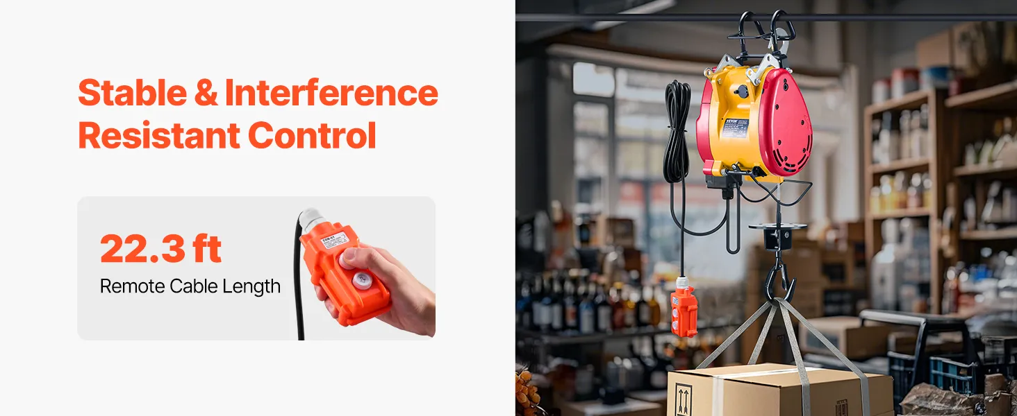 Tento prenosný elektrický kladkostroj má 1800W motor, nosnosť 1100 libier / 500 kg a výšku zdvihu až 98 stôp / 30 m. Ponúka káblové (22,3 stôp) a bezdrôtové (492-656 stôp) ovládanie. Dvojitý 2,2-palcový hák zabezpečuje stabilitu pri rôznych úlohách.