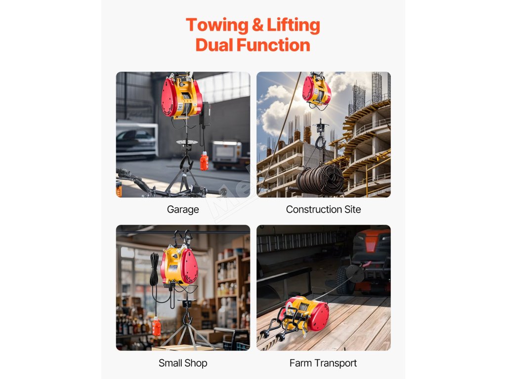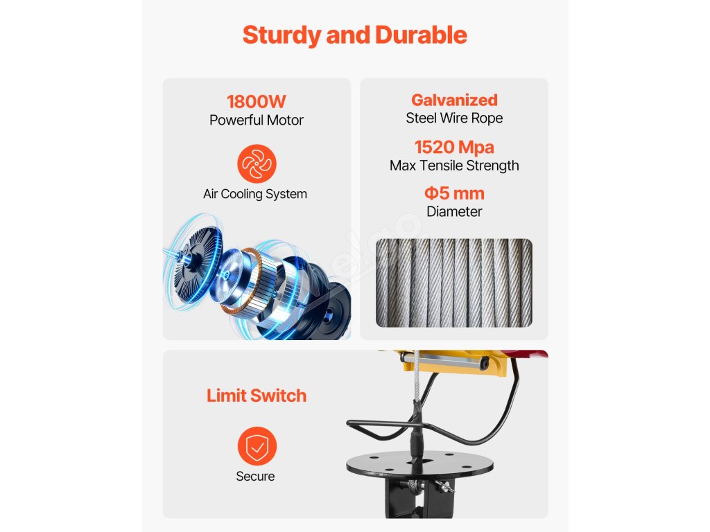 Vďaka 1800W motoru a vysokopevnostným materiálom dokáže tento prenosný elektrický kladkostroj ľahko zdvíhať ťažké predmety, čím výrazne zvyšuje efektivitu práce.