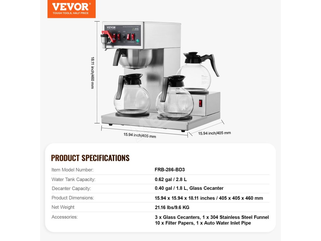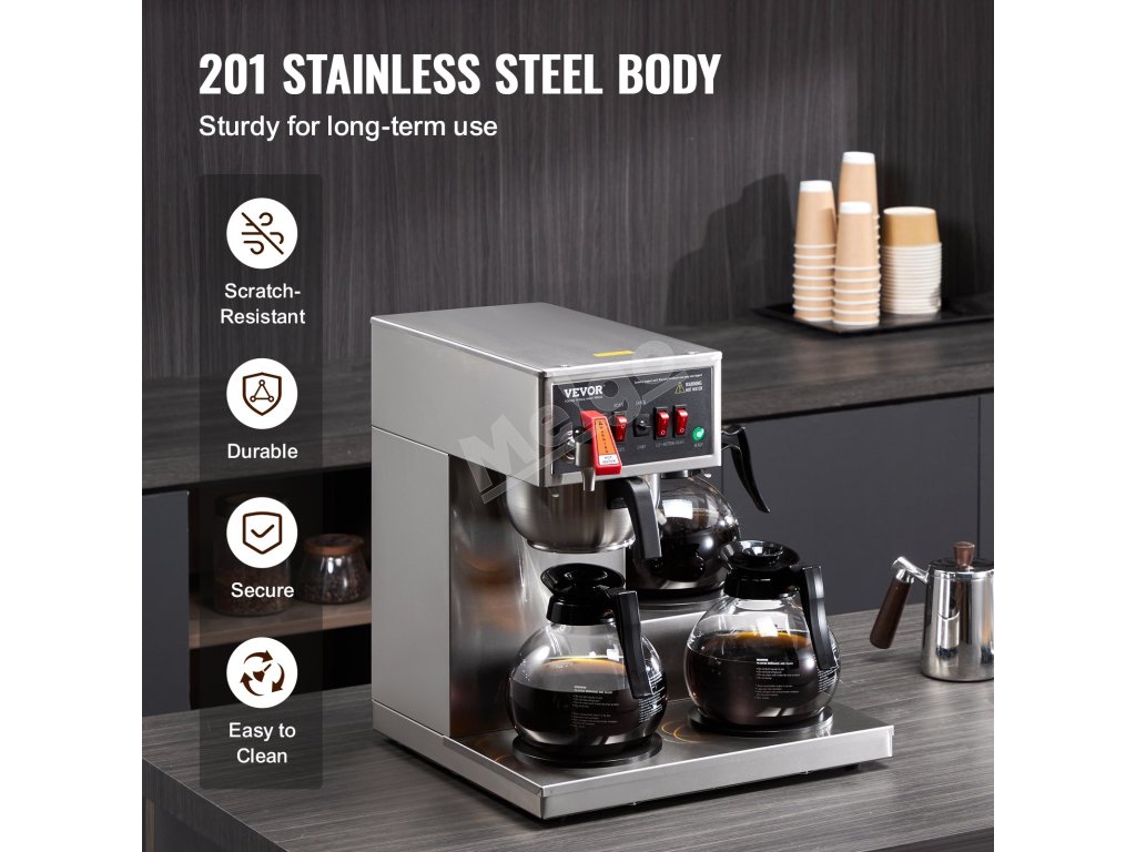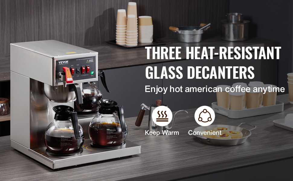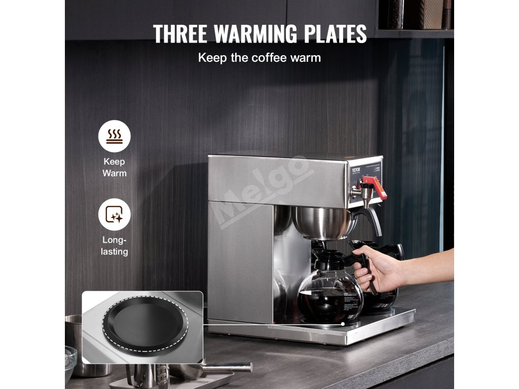 Tento komerčný kávovar, vybavený dvoma nahrievacími platňami, udržiava počas prevádzky 3 sklenené karafy teplé, vďaka čomu máte kedykoľvek k dispozícii horúcu kávu.