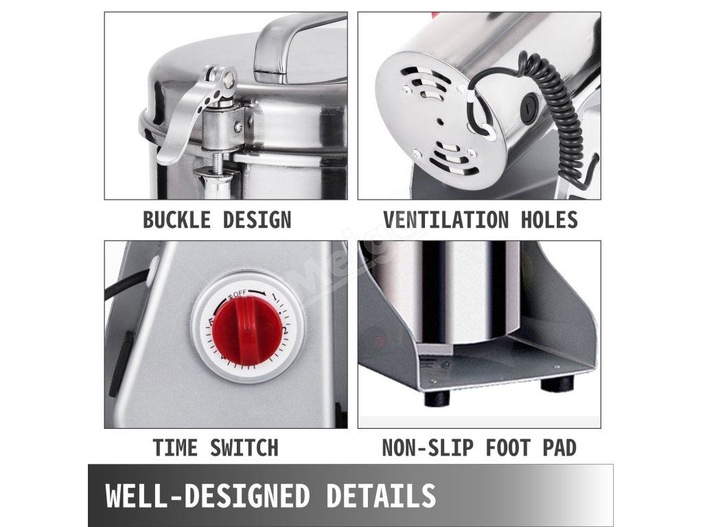 Je vyrobený z odolného a pevného materiálu z nehrdzavejúcej ocele. Má ostrú čepeľ s rýchlosťou otáčania 28 000 ot/min, ktorá dokáže rýchlo a ľahko rozbiť všetky druhy dehydrovaných potravín.