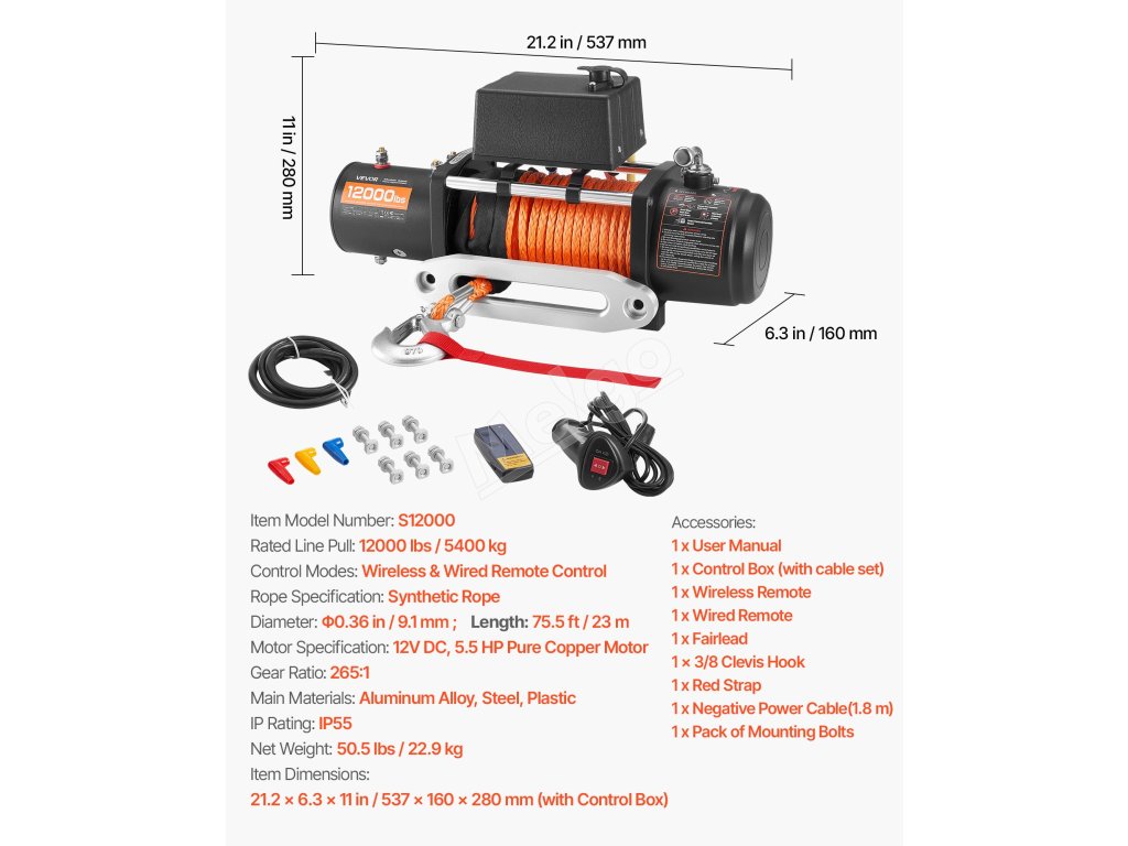 Elektrický naviják 5400 kg 12V φ9,1 mm × 23 m diaľkové ovládanie