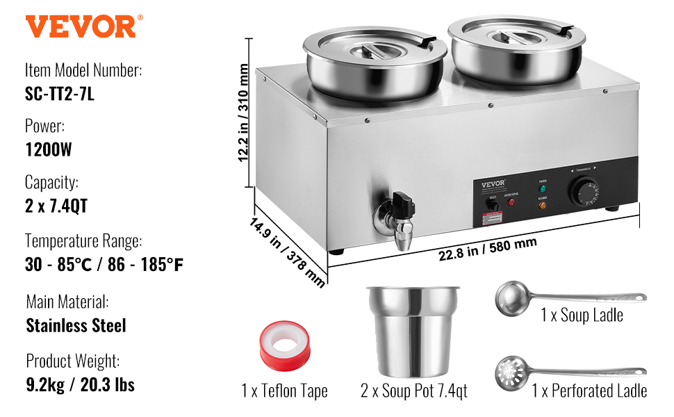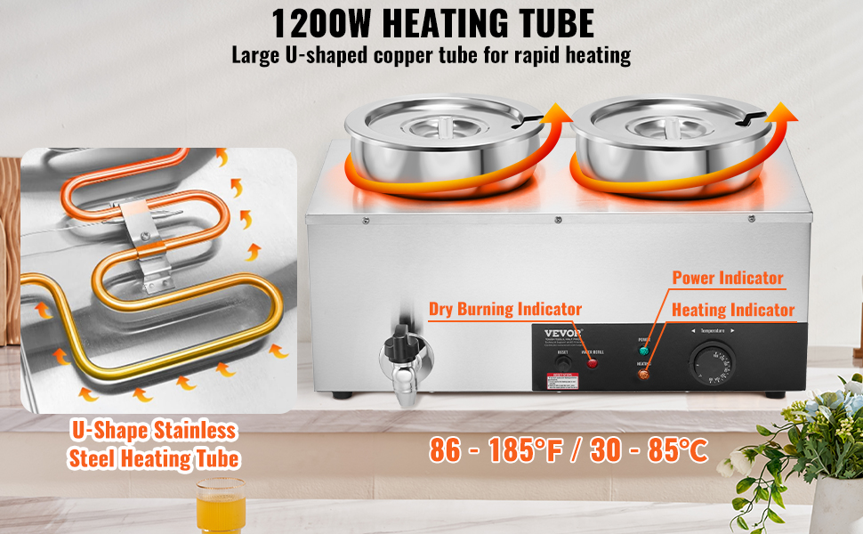 Tento ohrievač polievky je vybavený výkonným 1200-wattovým motorom, ktorý rýchlo ohrieva vaše jedlo, aby si zachovalo svoju horúcu a lahodnú chuť. Teplotu môžete nastaviť podľa svojich preferencií. Ideálny pre komerčné prostredia, ako sú reštaurácie, hotely a párty.
