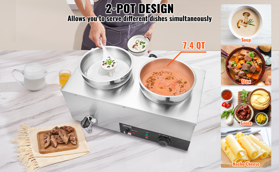 Elektrický ohrievač polievok je dodávaný s 2 hrncami, každý s objemom 7,4 QT. Umožňuje vám zohriať väčšie množstvo jedla naraz, aby vaše jedlá zostali teplé a pripravené.