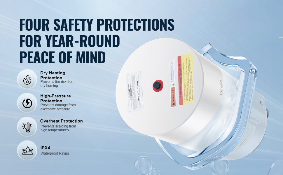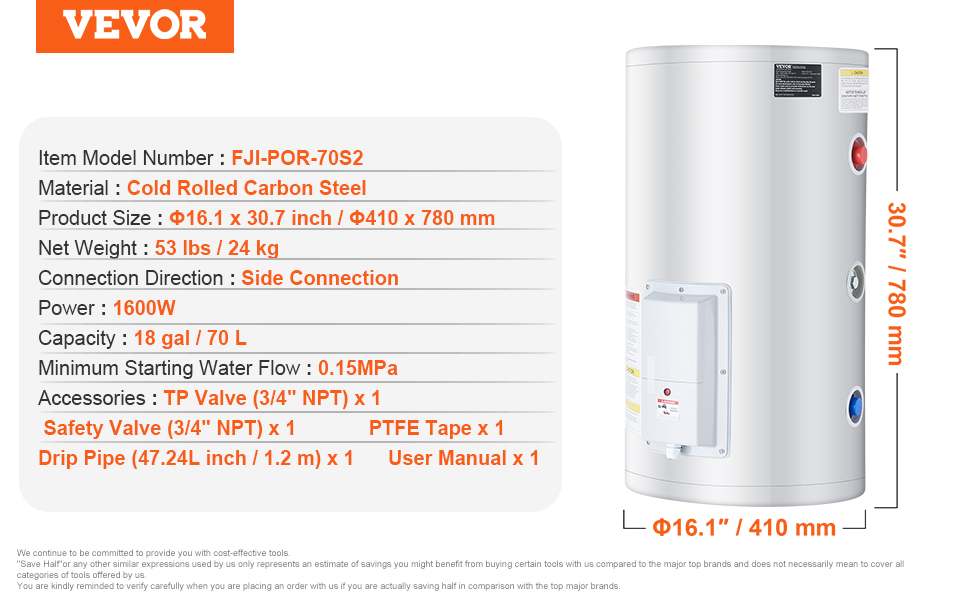 Nádržový ohrievač vody je vyrobený z vysokokvalitných materiálov pre dlhú životnosť. Poskytuje veľkú kapacitu teplej vody, ktorá sa ohrieva až na 167℉ / 75 ℃ s nepretržitou dodávkou počas 24 hodín. Medzi bezpečnostné funkcie patrí LED displej a ochrana proti prehriatiu pre spoľahlivé používanie.