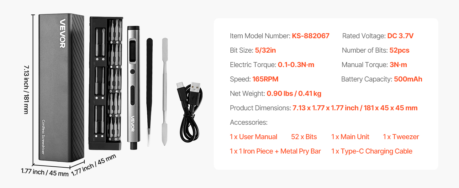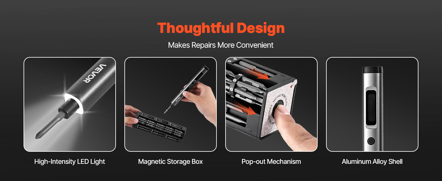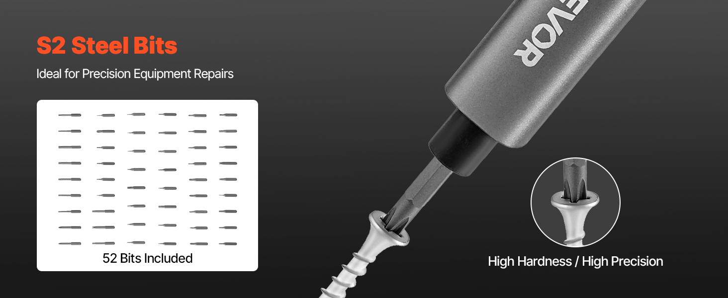 Bity z ocele S2 s tvrdosťou 58 HRC poskytujú silný a stabilný výkon počas precíznych opráv. Táto súprava elektrických skrutkovačov zaručuje presnú manipuláciu so spoľahlivými výsledkami - od telefónov a notebookov až po elektronické zariadenia.