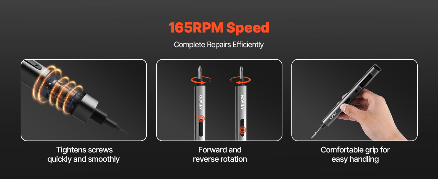 Rýchlosť otáčania 165 otáčok za minútu umožňuje rýchlu prácu, či už ide o montáž nábytku alebo opravu malých zariadení. Ergonomická rukoväť mini elektrického skrutkovača poskytuje pohodlný úchop a zaručuje plynulé skrutkovanie bez námahy pri dlhšom používaní.