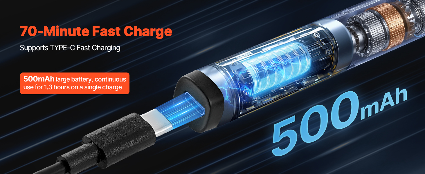 Tento nabíjateľný elektrický presný skrutkovač je napájaný 500 mAh batériou a na jedno nabitie vydrží pracovať až 1,3 hodiny. Vďaka modernému portu na rýchle nabíjanie typu C trvá dosiahnutie plného výkonu len 70 minút, čím sa minimalizujú prestoje a vaša práca nepretržite prebieha.