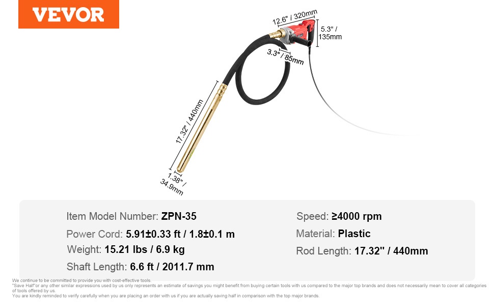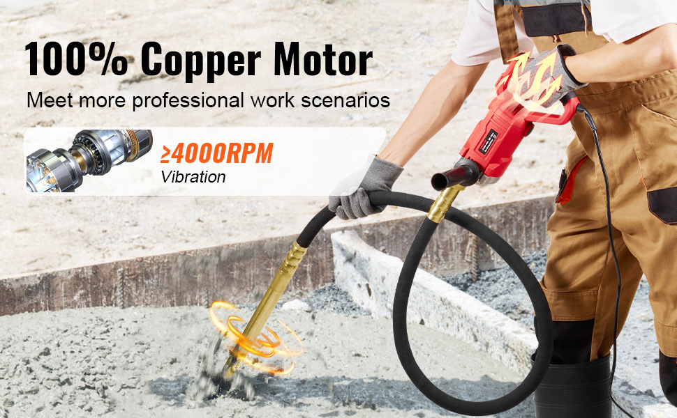 Je vybavený medeným motorom, poskytuje frekvenciu vibrácií 4000 RPM a účinne prenáša vibrácie cez betón, čím zabezpečuje rovnomerné rozloženie a pevné zhutnenie.