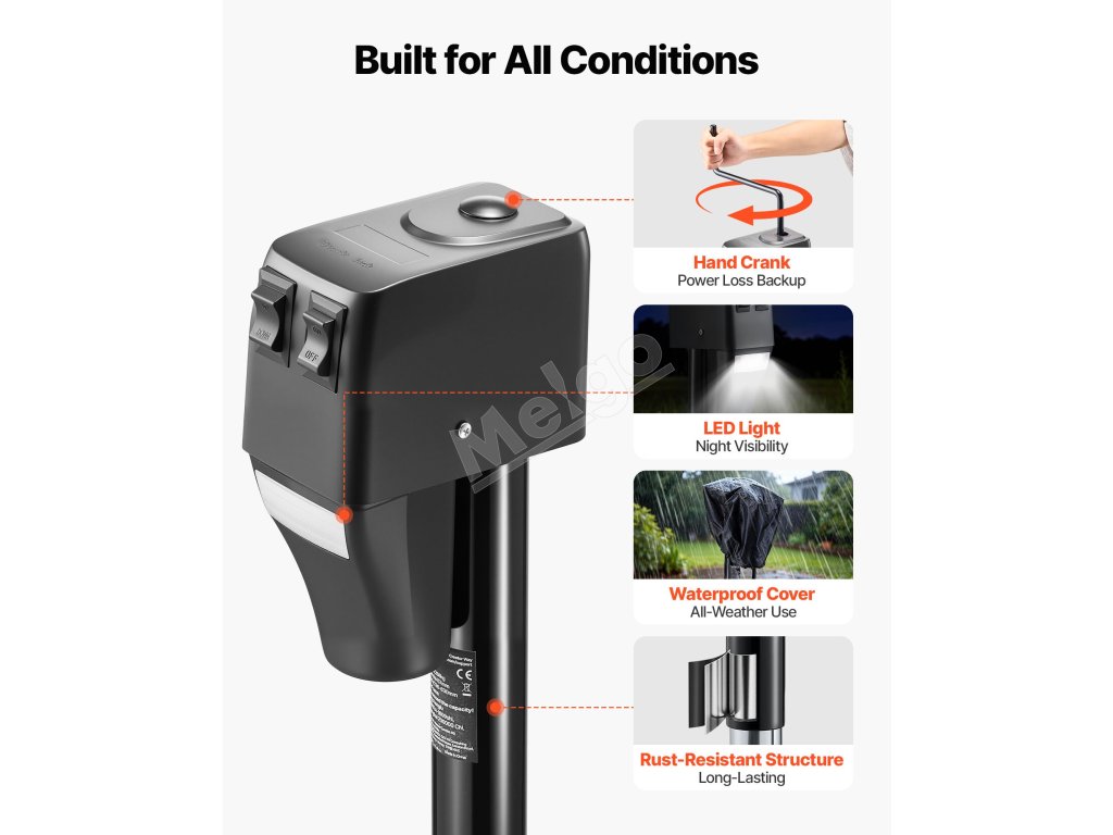 Plastový kryt odolný voči poveternostným vplyvom chráni motor a spínače pred prachom a dažďom, čím zabezpečuje spoľahlivú a dlhú životnosť.
