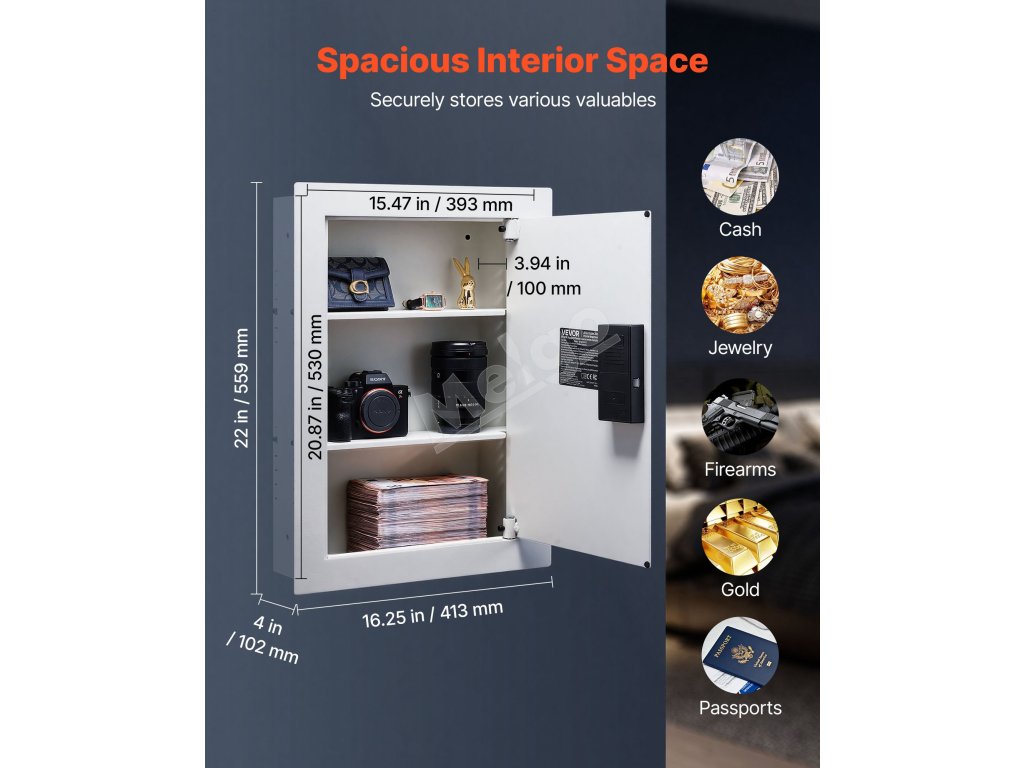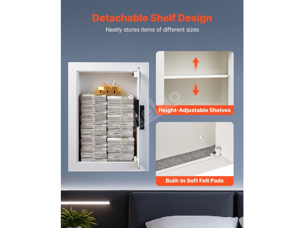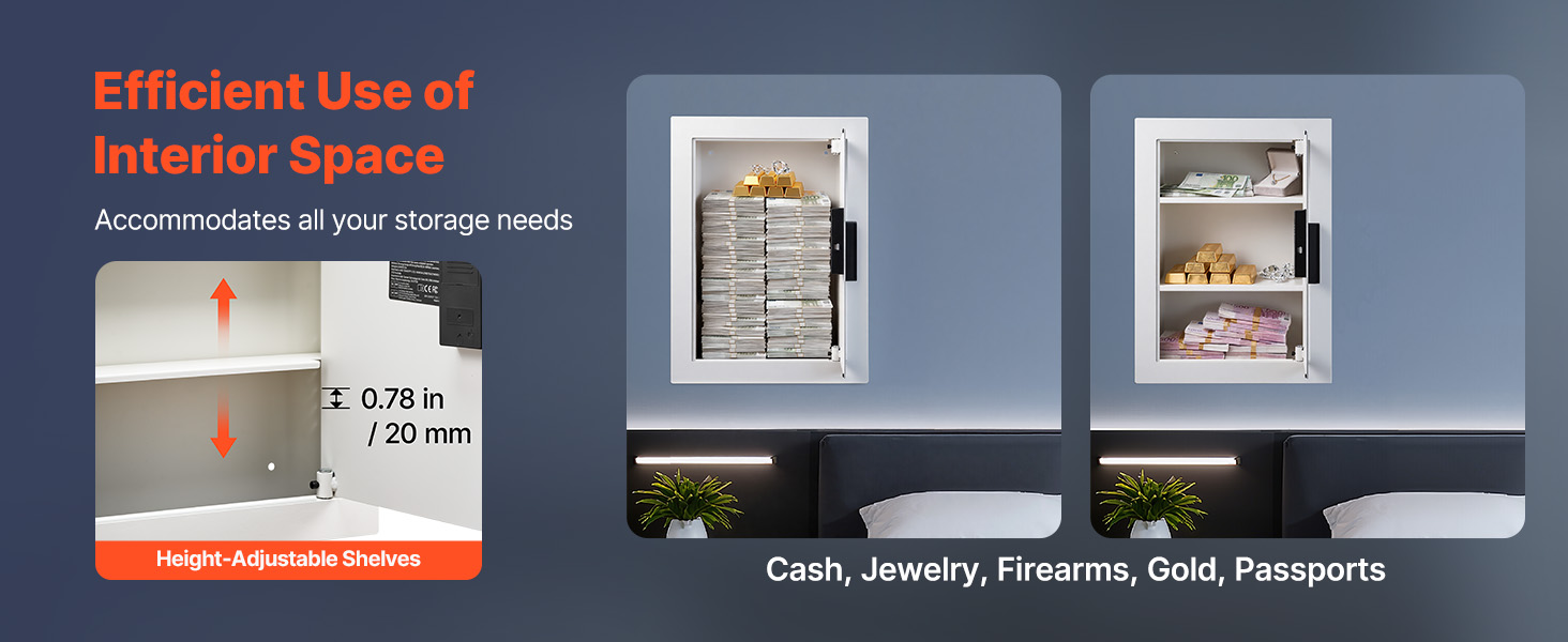 Táto nástenná bezpečnostná schránka je vybavená nastaviteľnou policou, ktorá sa prispôsobí predmetom rôznych veľkostí a typov. Ľahko do nej uložíte hotovosť, šperky, strelné zbrane, zlato alebo pasy a udržíte cennosti v poriadku a bezpečí.
