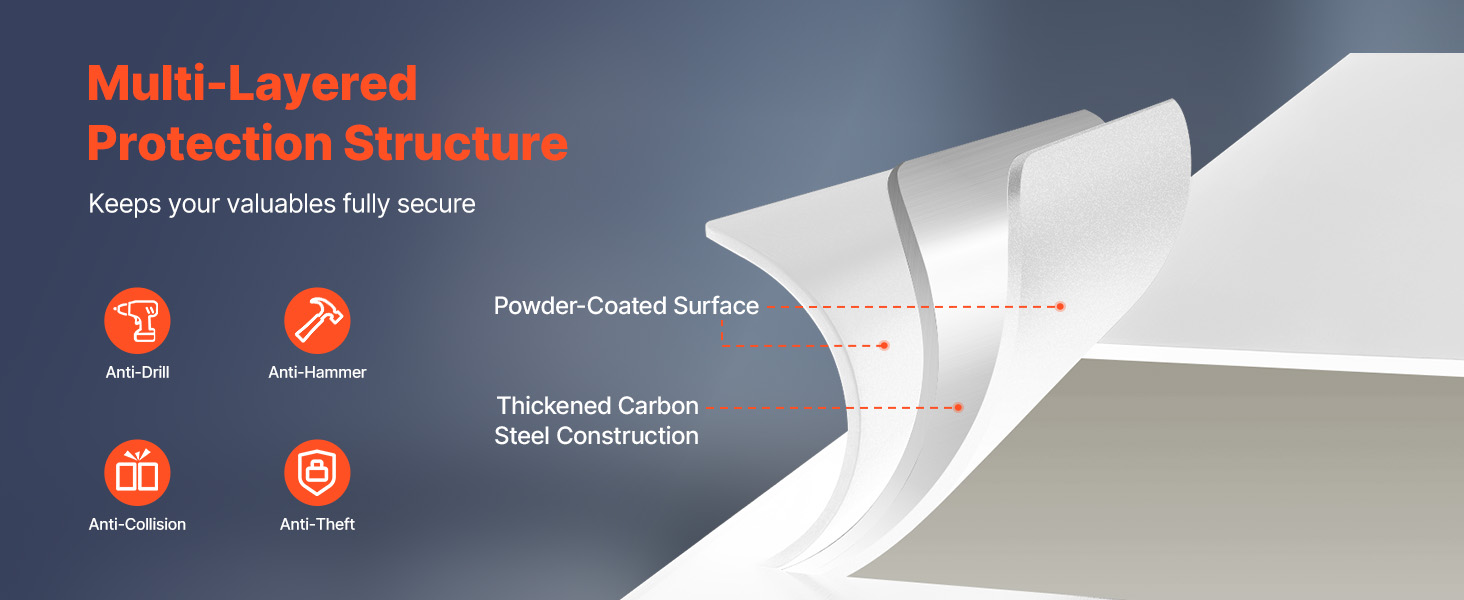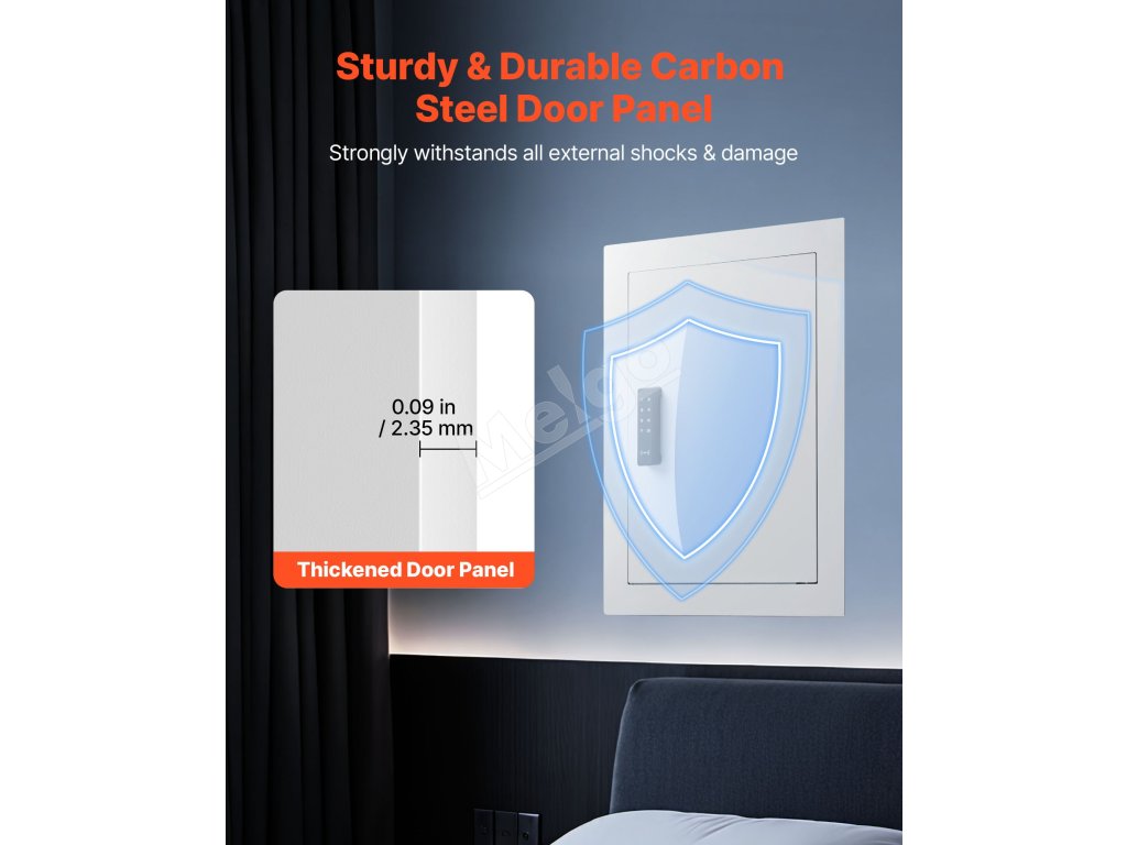 Tento trezor do steny vyrobený zo zosilnenej uhlíkovej ocele odolá vŕtačkám, kladivám a iným vonkajším nárazom, aby cennosti zostali v bezpečí. Povrchová úprava práškovou farbou zvyšuje odolnosť proti korózii a opotrebovaniu, čím zabezpečuje dlhodobú trvanlivosť a spoľahlivosť.