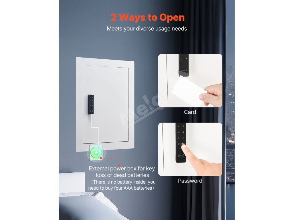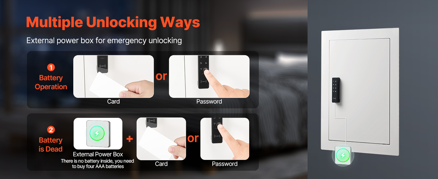 Tento nástenný trezor podporuje všestranný prístup; pri vypnutom napájaní používa 4 až 15-miestny kód alebo kartu s otočným gombíkom. Ak je batéria vybitá, pripojte externý napájací box a odomknite ho pomocou kódu alebo karty s otočným gombíkom. Napájaný núdzový port vám zabezpečí spoľahlivý prístup.